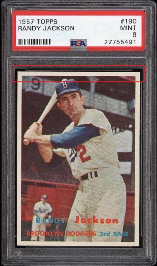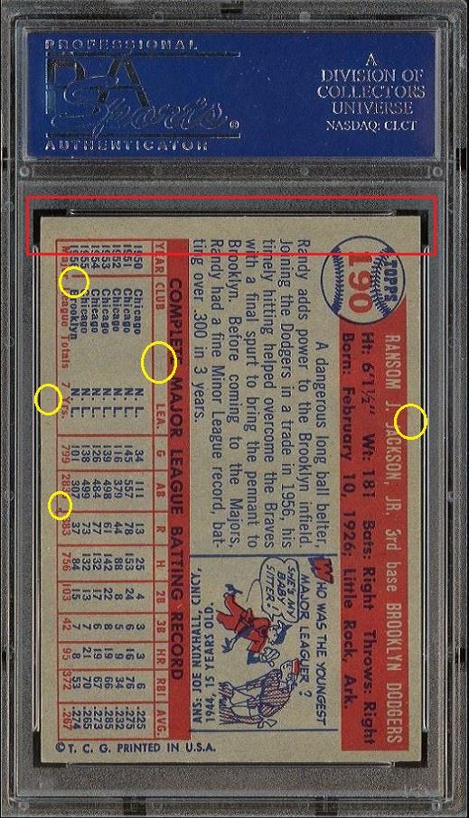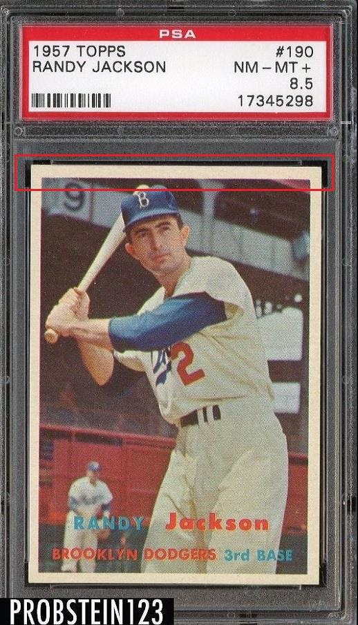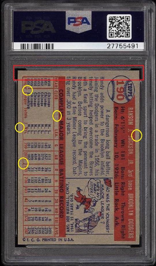 PSA Set Registry: MavFanIngle 1957 Topps Randy Jackson #190 Value gain of $97.00 This card was purchased by masked VCP ID m***h (Johnny Adams, Jr.) from Ebay seller probstein123 as a PSA 8.5 for $92.50 on September 26, 2016. VCP link: https://vintagecardprices.com/card/b.../66218/PSA/8.5 Same card was sold by PWCC as a PSA 9 for $189.50 on October 10, 2017. VCP link: https://vintagecardprices.com/card/b...90/66218/PSA/9 Yellow circles are print, fiber, or chipping identifiers. Red box identifies trimmed top edge. ![]() ![]() ![]()