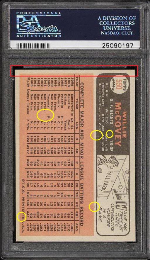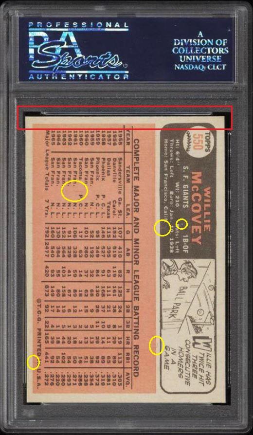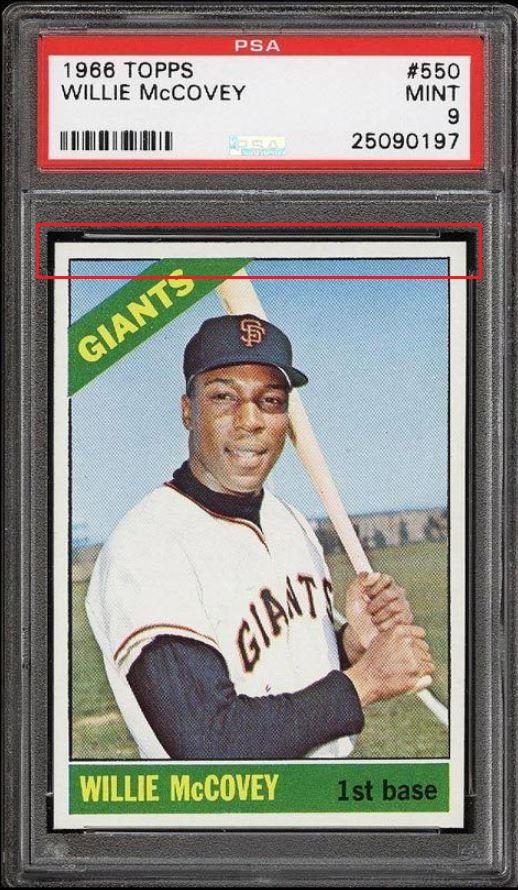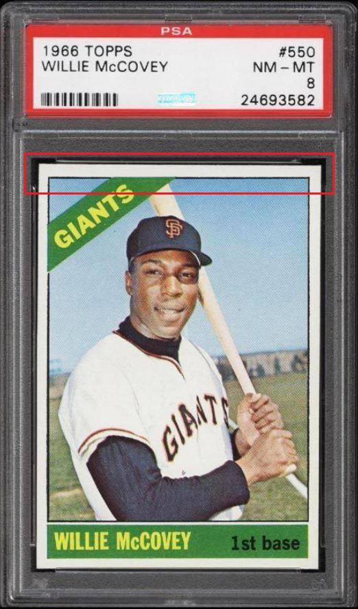 PSA Set Registry: none 1966 Topps Willie McCovey #550 Value gain of $303.99 This card was purchased by masked VCP ID m***h (Johnny Adams, Jr.) from Ebay seller PWCC as a PSA 8 for $189.01 on September 13, 2015. VCP link: https://vintagecardprices.com/card/b...=&limit=999999 Same card was sold by PWCC as a PSA 9 for $493.00 on February 10, 2016. VCP link: https://vintagecardprices.com/card/b...t/149421/PSA/9 ***Card was just recently sold again by PWCC for $577.33 on 10/15/2019. VCP link: https://vintagecardprices.com/card/b...t/149421/PSA/9 Yellow circles are print, fiber, or chipping identifiers. Red box identifies trimmed top edge. ![]() ![]() ![]()