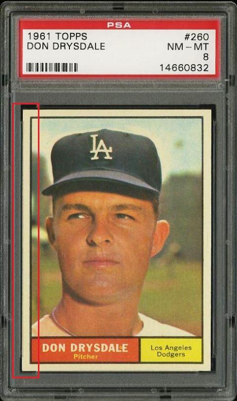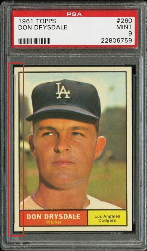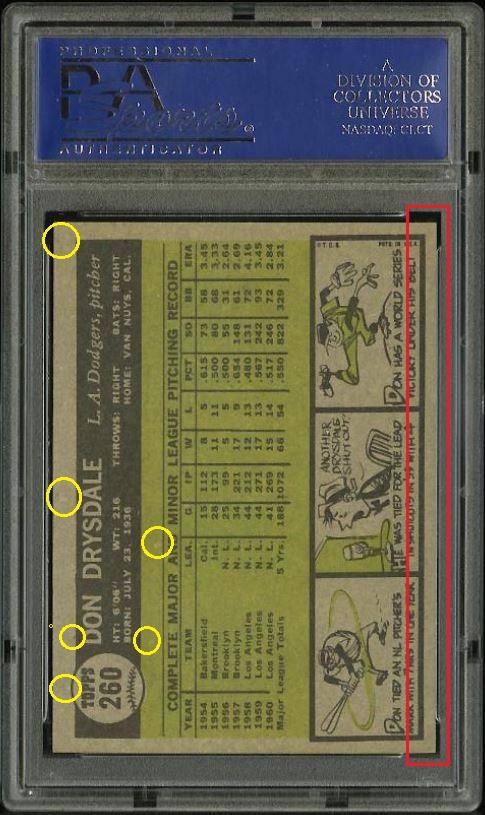 PSA Set Registry: none 1961 Topps Don Drysdale #260 Value gain of $125.51 This card was purchased by masked VCP ID m***h (Johnny Adams, Jr.) from Ebay seller PWCC as a PSA 8 for $92.99 on February 06, 2014. PWCC link: https://www.pwccmarketplace.com/items/851140 Same card was sold by PWCC as a PSA 9 for $218.50 on October 11, 2017. PWCC link: https://www.pwccmarketplace.com/items/1018137 Yellow circles are print, fiber, or chipping identifiers. Red box identifies trimmed left edge. ![]() ![]() ![]() ![]() ![]()