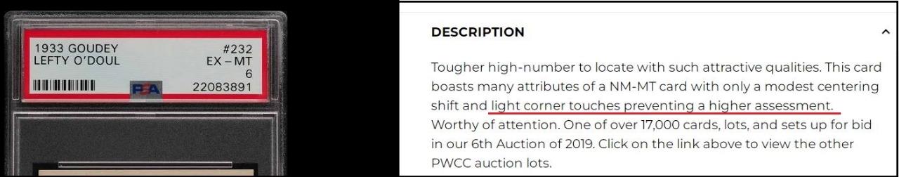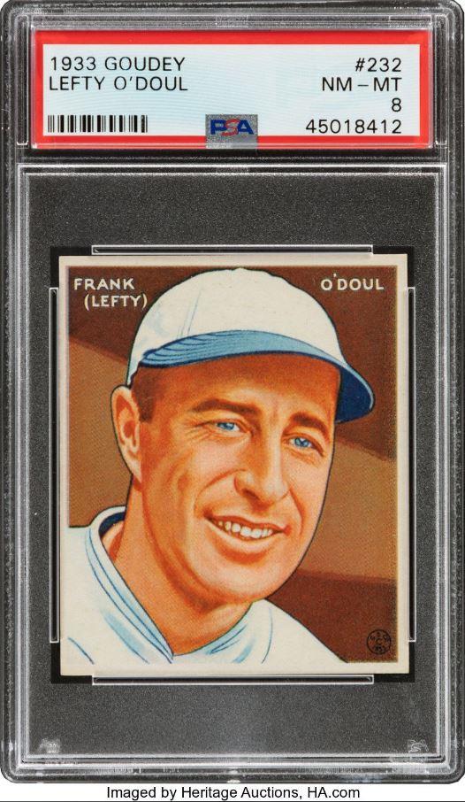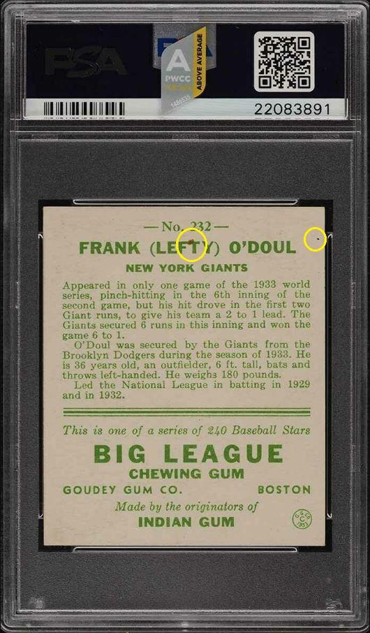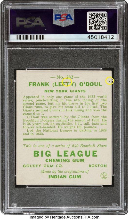 It is difficult to see any changes with these images. Pevarnik purchased the card from PWCC and Brent Huigens stickered it. So I checked the sale description and found this: ![]() PSA Cert # 45018412 1933 Goudey Lefty O'Doul #232 Value gain of $1,619.50 Was a PSA 6, now a PSA 8. Pevarnick purchased the card from PWCC on June 10, 2019 for $210.50. Card was consigned to and sold by Heritage Auctions on July 31, 2020 for $1,830.00 Same card front as a PSA 6 and PSA 8: ![]() ![]() Same card back as a PSA 6 and PSA 8: ![]()