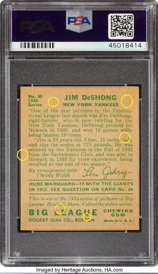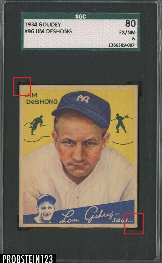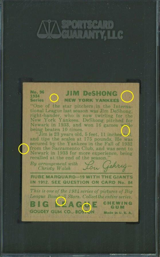 1934 Goudey Jim DeShong #96 Value gain of $1,575.50 PSA Set Registry:private This card was purchased by Ebay buyer ID bbcinv (Dennis Pevarnick) from Ebay seller probstein123 as a SGC 6 for $224.50 on June 13, 2019. Same card was consigned to and sold by Heritage Auctions as a PSA 8.5 for $1,800.00 on February 23, 2020. Yellow circles are print, fiber, or chipping identifiers. Red boxes identify sharpened corners. ![]() ![]() ![]() ![]() ![]() ![]()