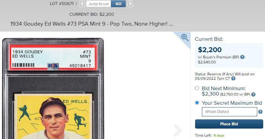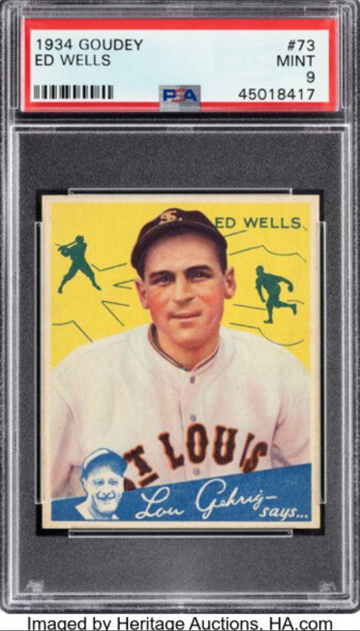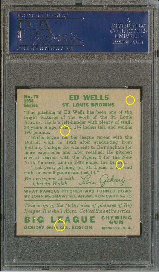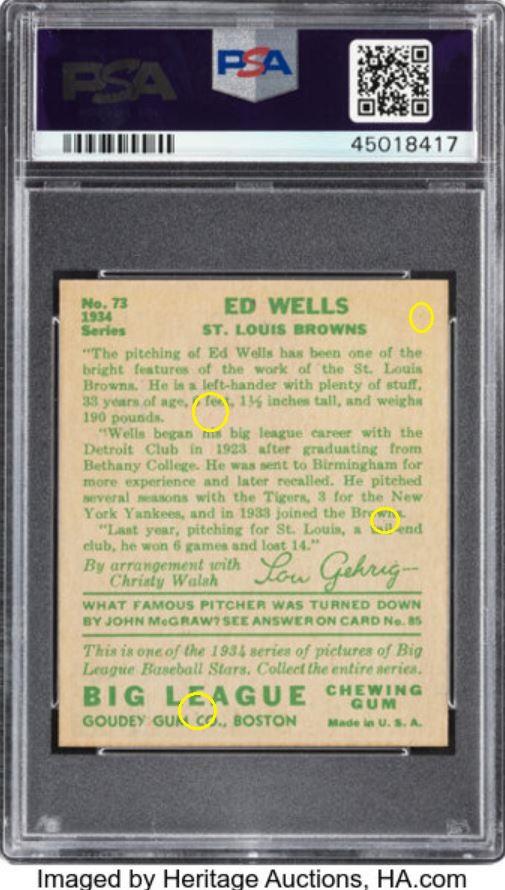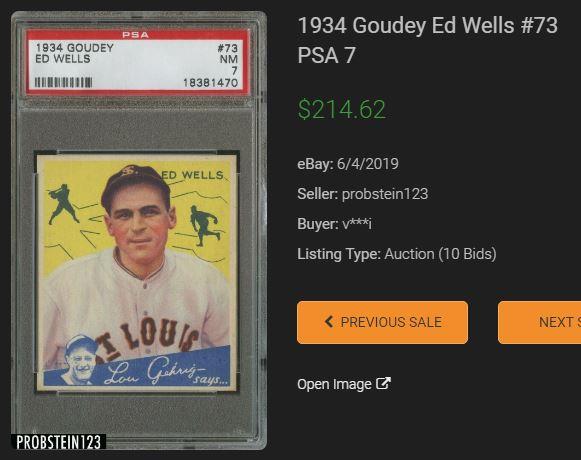 are Pevarnick cards coming up for sale for the first time. This one received a 2 grade bump. POP 2 - none higher It is difficult to see any changes with these images. PSA Cert # 45018417 1934 Goudey Ed Wells #73 Was a PSA 7, now a PSA 9. Pevarnick purchased the card on June 04, 2019 for $214.62. Current bid is $2,200.00. Purchase: ![]() Current listing at Heritage Auctions: Link:https://sports.ha.com/itm/baseball/1...umbnail-071515 ![]() Same card front as a PSA 7 and PSA 9: ![]() ![]() Same card back as a PSA 7 and PSA 9: ![]()