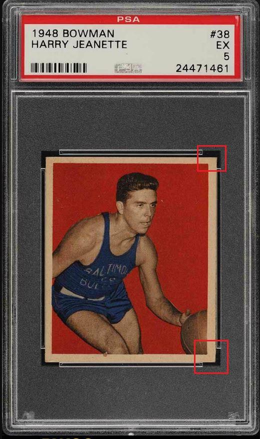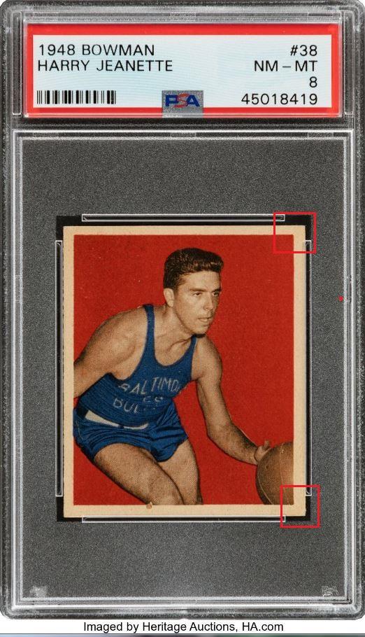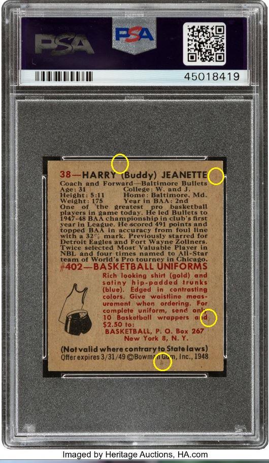 1948 Bowman Harry Jeanette #38 Value gain of $597.50 PSA Set Registry: maxmania8 This card was purchased by Ebay buyer ID bbcinv (Dennis Pevarnick) from Ebay seller PWCC as a PSA 5 for $182.50 on August 19, 2019. Same card was consigned to and sold by Heritage Auctions as a PSA 8 for $780.00 on July 31, 2020. Yellow circles are print, fiber, or chipping identifiers. Red boxes identify tightened corners. ![]() ![]() ![]() ![]() ![]() ![]()