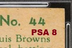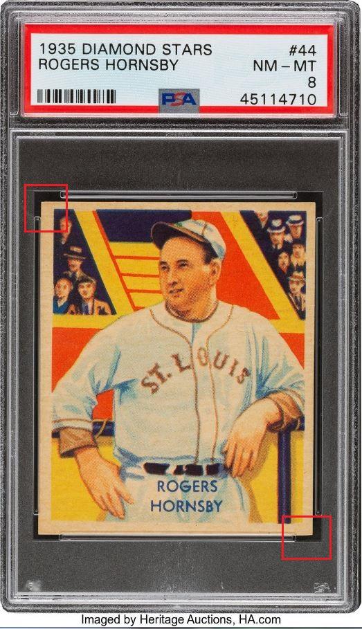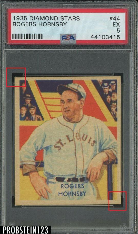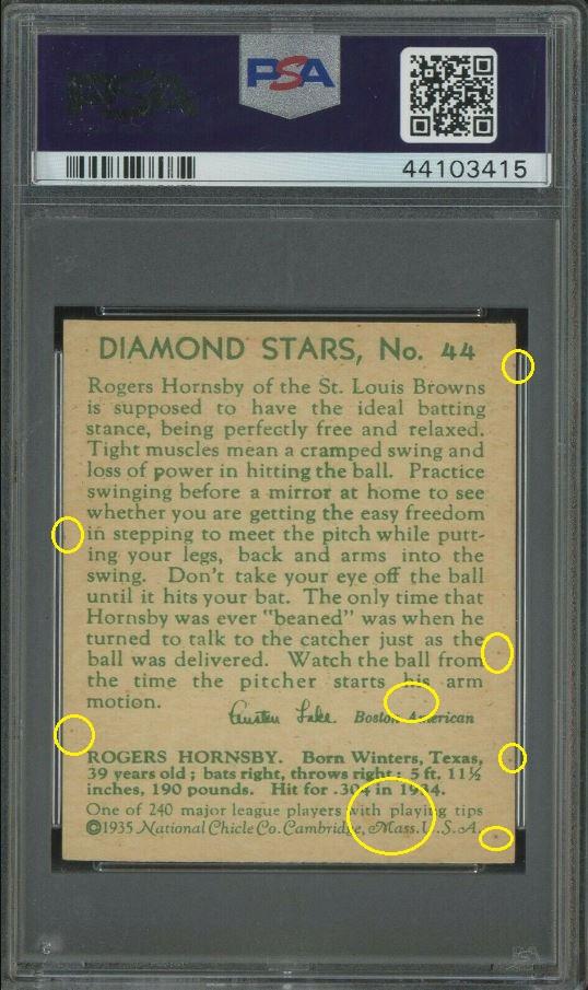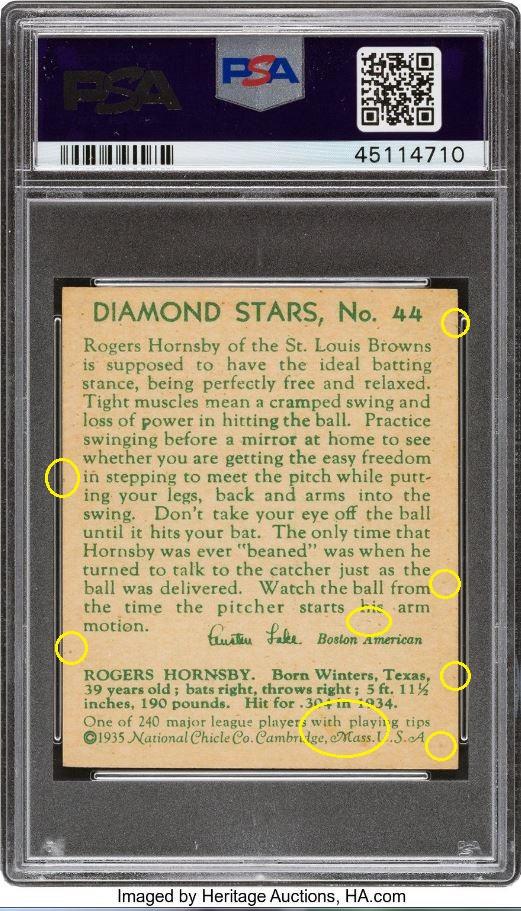1935 Diamond Stars Rogers Hornsby #44 Value gain of $796.03 PSA Set Registry: none found This card was purchased by Ebay buyer ID bbcinv (Dennis Pevarnick) from Ebay seller probstein123 as a PSA 5 for $223.97 on October 21, 2019. Same card was consigned to and sold by Heritage Auctions as a PSA 8 for $1020.00 on May 09, 2020. Yellow circles are print, fiber, or chipping identifiers. Red boxes identify sharpened corners with material removed. ![]() ![]() ![]() ![]() ![]() ![]()