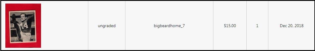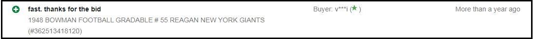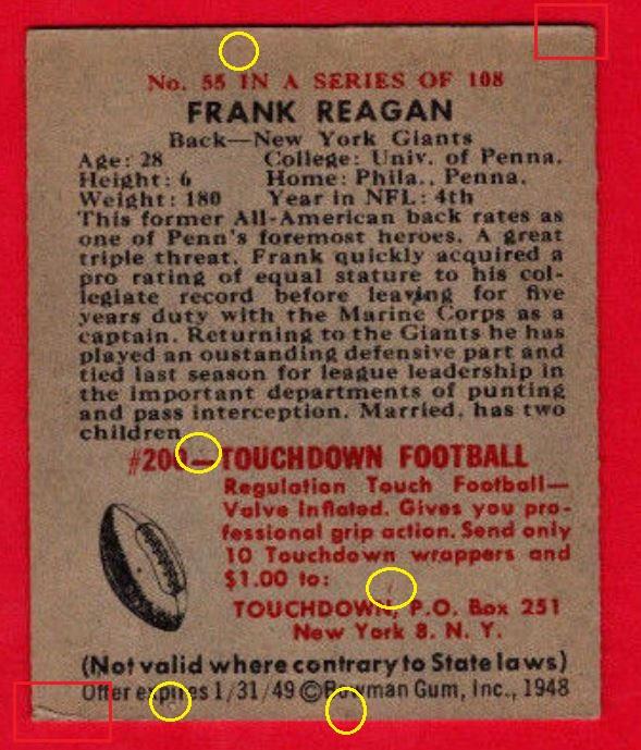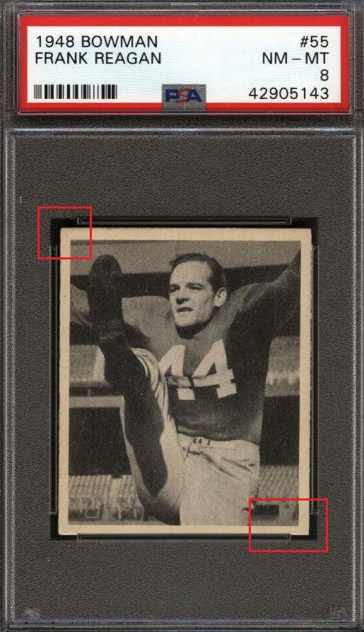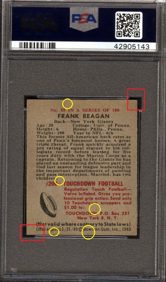 PSA Cert #42905143 1948 Bowman Frank Reagan #55 Value gain of $108.99 PSA Set Registry: none found This card was purchased by Ebay buyer ID bbcinv (Dennis Pevarnick) from Ebay seller bigbeardhome_7 as a raw card for $15.00 on December 20, 2018. Purchase as found in CardTarget.Com: ![]() This is the feedback that the seller left for v***i (bbcinv): ![]() Same card was sold by bbcinv (Dennis Pevarnick) as a PSA 8 for $123.99 on May 20, 2019. Yellow circles are print, fiber, or chipping identifiers. Red boxes identify pressed out creases and sharpened corners with material removed. ![]() ![]() ![]() ![]() ![]()