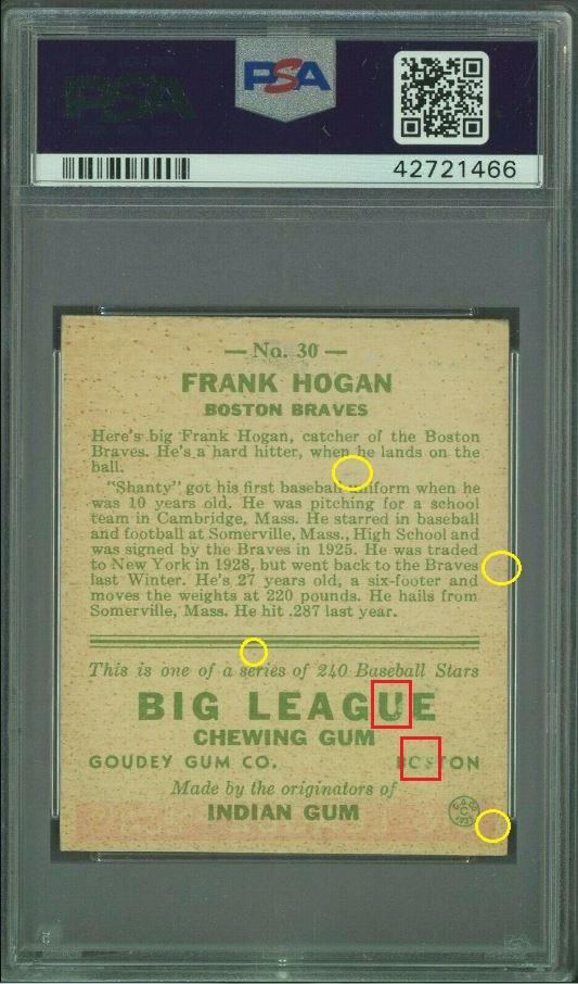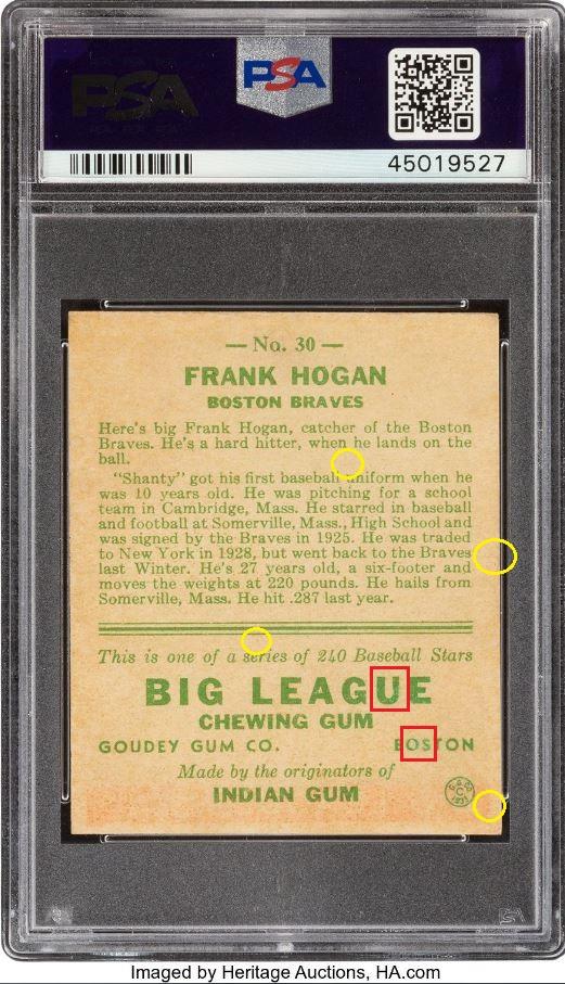1933 Goudey Frank Hogan #30 Value gain of $5,077.50 PSA Set Registry: private This card was purchased by Ebay buyer ID bbcinv (Dennis Pevarnick) from Ebay seller probstein123 as a PSA 5 for $202.50 on July 23, 2019. Same card was consigned to and sold by Heritage Auctions as a PSA 8 for $5,280.00 on February 23, 2020. Yellow circles are print, fiber, or chipping identifiers. Red boxes identify: 1) ink or spot removal on front resulting in removal of yellow ink 2) green ink added to type in several letters 3) Many spots removed or minimized from entire back of card ![]() ![]() ![]() ![]() ![]()