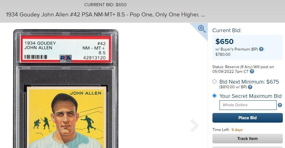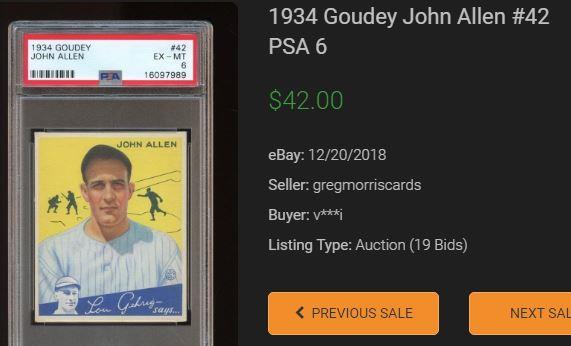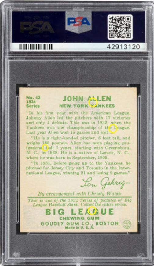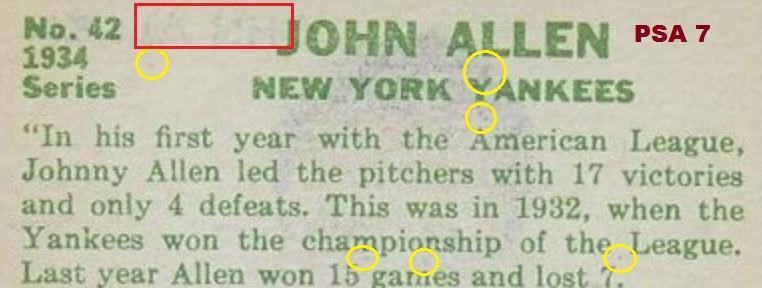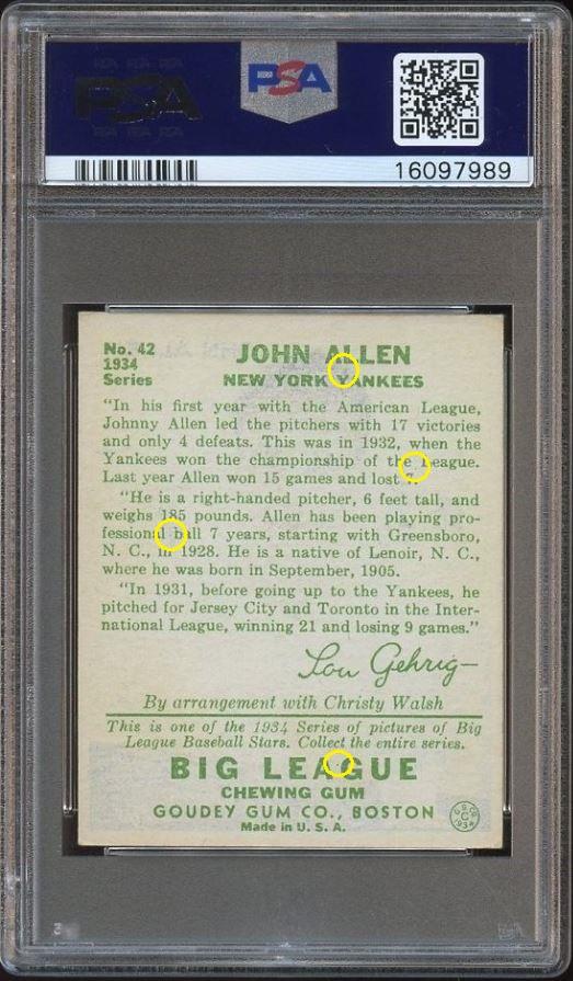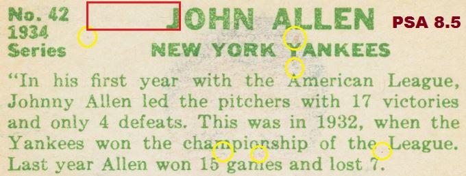 are Pevarnick cards coming up for sale for the first time. This one received a 1.5 grade bump. The bottom edge has been trimmed and excess ink transfer has been removed/minimized on the back. PSA Cert # 42913120 1934 Goudey John Allen #42 Was a PSA 7, now a PSA 8.5. POP 1 with 1 higher Pevarnick purchased the card from Ebay seller gregmorriscards on December 20, 2018 for $42.00. Purchase: ![]() Current bid is $650.00. Current listing at Heritage Auctions: Link:https://sports.ha.com/itm/baseball/1...umbnail-071515 ![]() Trimmed at bottom: ![]() ![]() Matching fibers or paper stock imperfections an closeup of blue ink transfer removal. ![]() ![]() Same card front as a PSA 7 and PSA 8.5: ![]() ![]() Same card back as a PSA 7 and PSA 8.5: ![]()