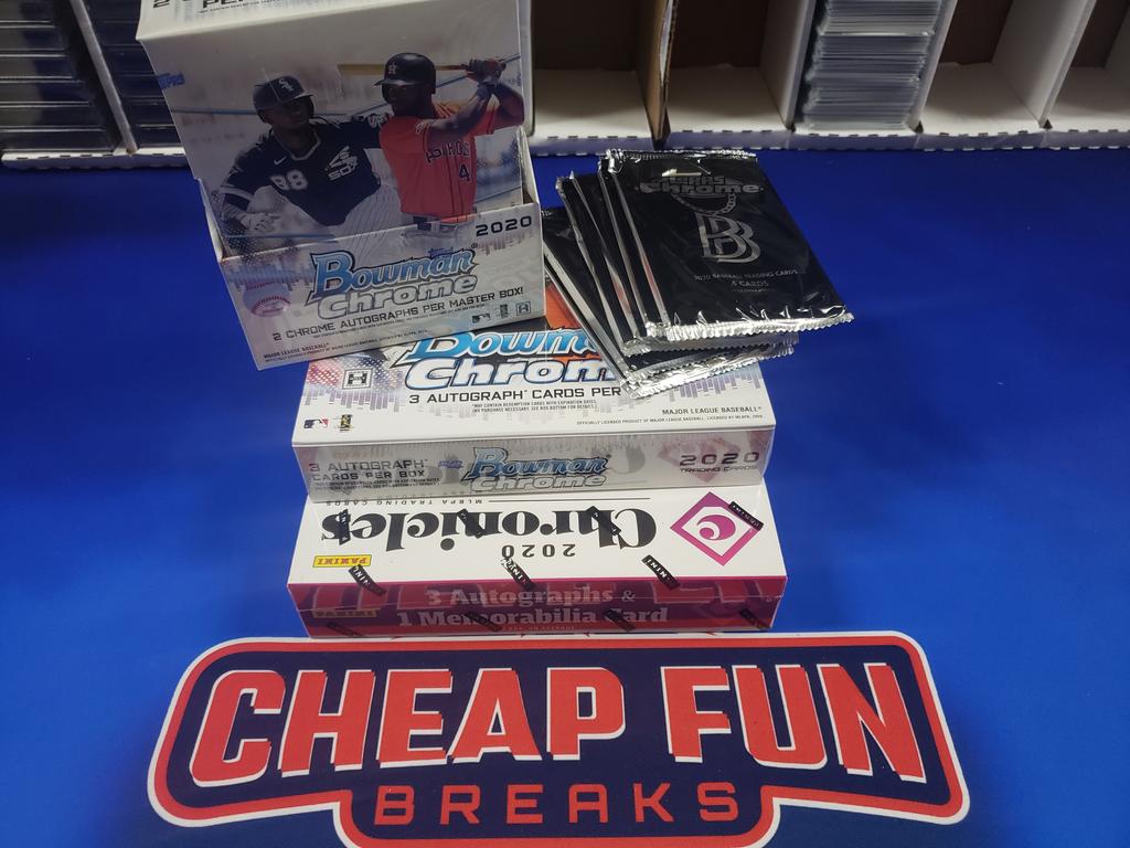 If you buy 12, I will get you into all 12 breaks. I cannot guarantee any spots otherwise. If you put "early breaks" but you are one of the last to pay, I can't move you up that far. I do my best. Each break has 1 2020 Bowman Hobby boxes, 1 2020 Bowman HTA boxes, 1 2020 Panini Chronicles & 6 packs of 2020 Baller Chrome! $36.99 - 12 breaks! This break is scheduled for tonight! To use the button: 1. Add your username in the blank box provided. 2. Adjust quantity and click update. 3. Click the button. 4. Make sure your address is correct. 5. Pay. I can only ship to the address attached to your payment. Angels Astros Athletics Blue Jays Braves Brewers Cardinals Cubs Diamondbacks Dodgers Giants Indians Mariners Marlins Mets Nationals Orioles Padres Phillies Pirates Rangers Rays Reds Red Sox Rockies Royals Tigers Twins White Sox Yankees