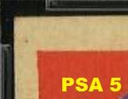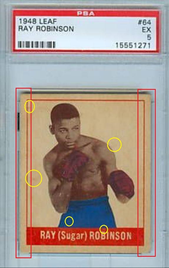 PSA Cert #18863281 1948 Leaf Boxing Sugar Ray Robinson #64 Value gain of $187.50 PSA Set Registry: none found This card was purchased by whitman111 (Gary Moser) from Ebay seller reggiebushsurf as a PSA 5 on March 08, 2009 for $46.00. Same card was sold by PWCC (Brent and Betsy Huigens) as a PSA 7 for $233.50 on December 02, 2011. Yellow circles are print, stain or fiber identifiers. Red squares identify trimmed left and right edges. No back images provided. ![]()