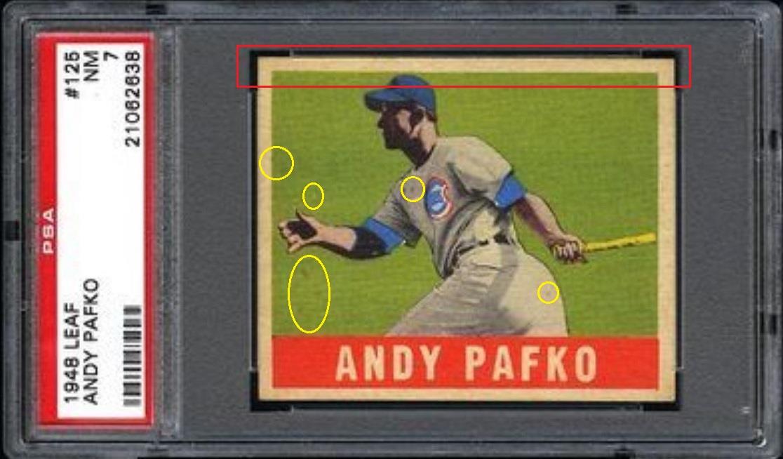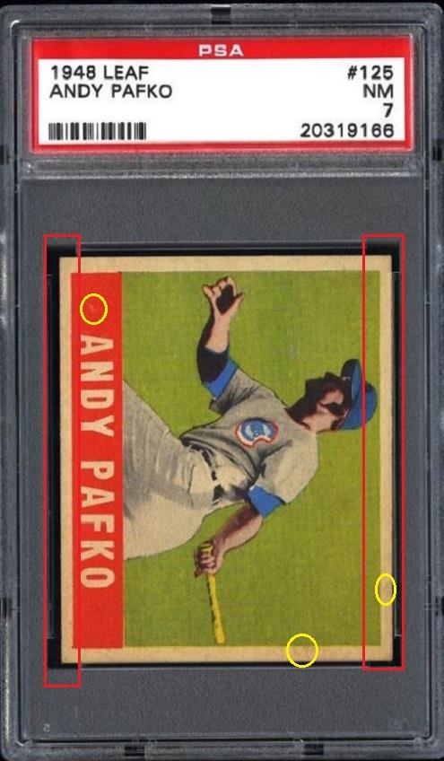 PSA Cert #20319166 1948 Leaf Andy Pafko #125 Value gain of $54.80 PSA Set Registry: Andrew's 1948 Leaf Basic Set This card was purchased by whitman111 (Gary Moser) from Ebay seller allmartysstuff as a PSA 5 on March 24, 2012 for $40.00. Same card was sold by PWCC (Brent and Betsy Huigens) as a PSA 7 for $94.80 on October 08, 2012. Yellow circles are print, stain or fiber identifiers. Red squares identify trimmed top and bottom edges. ![]() ![]() ![]()
