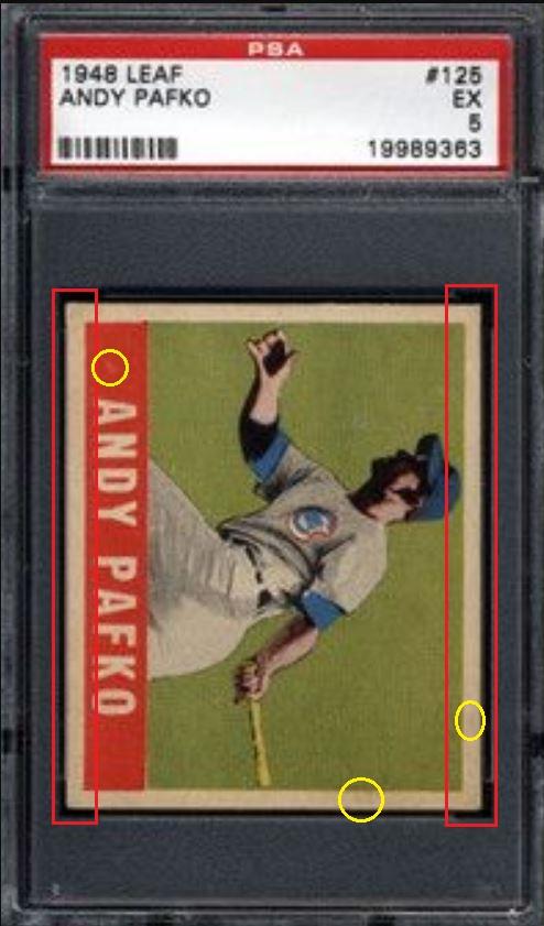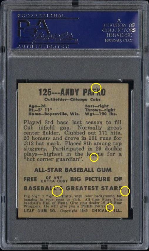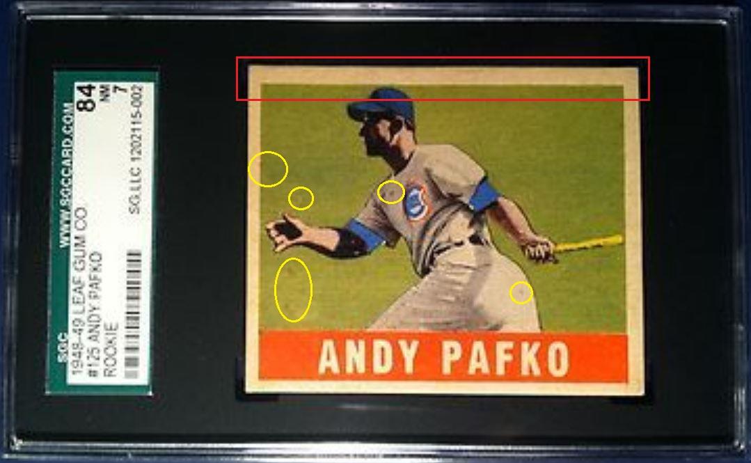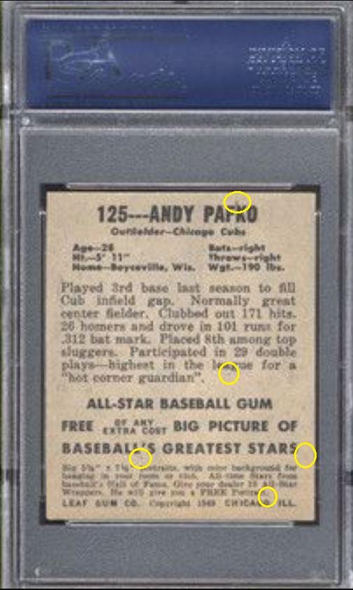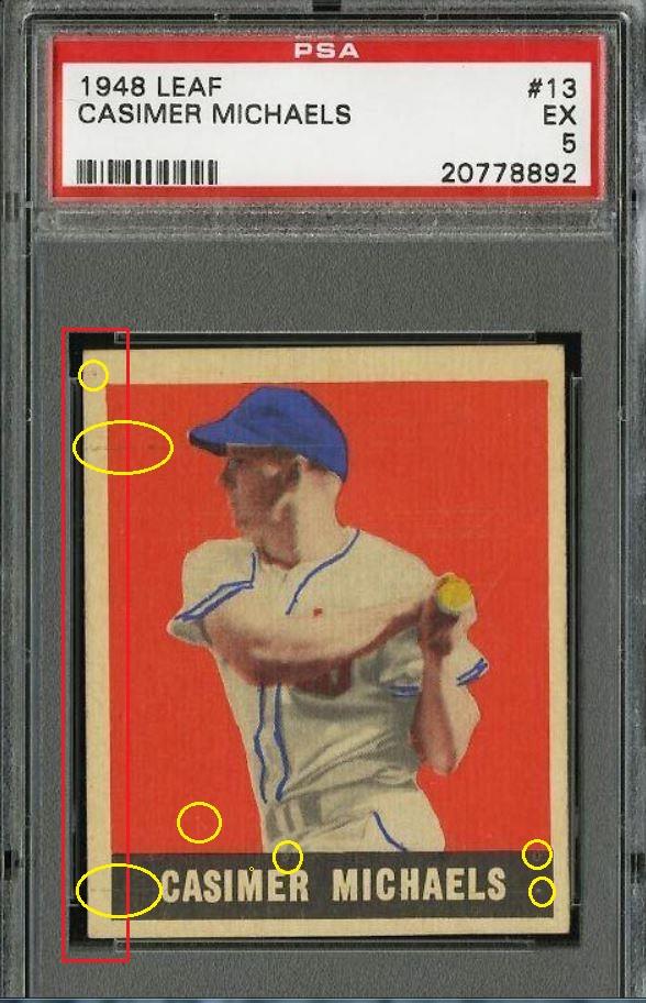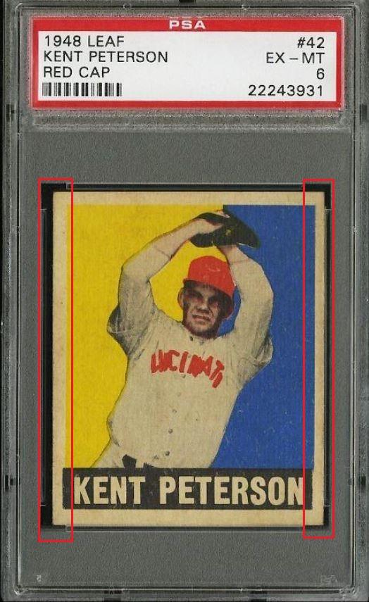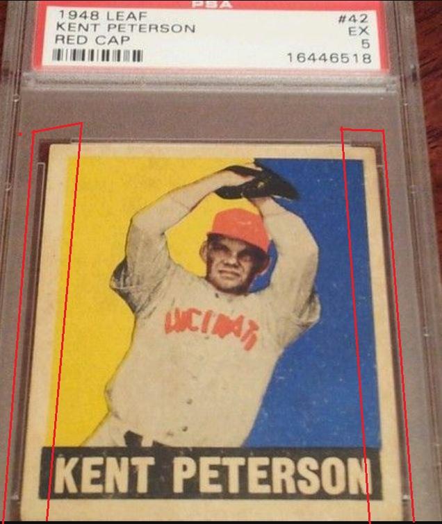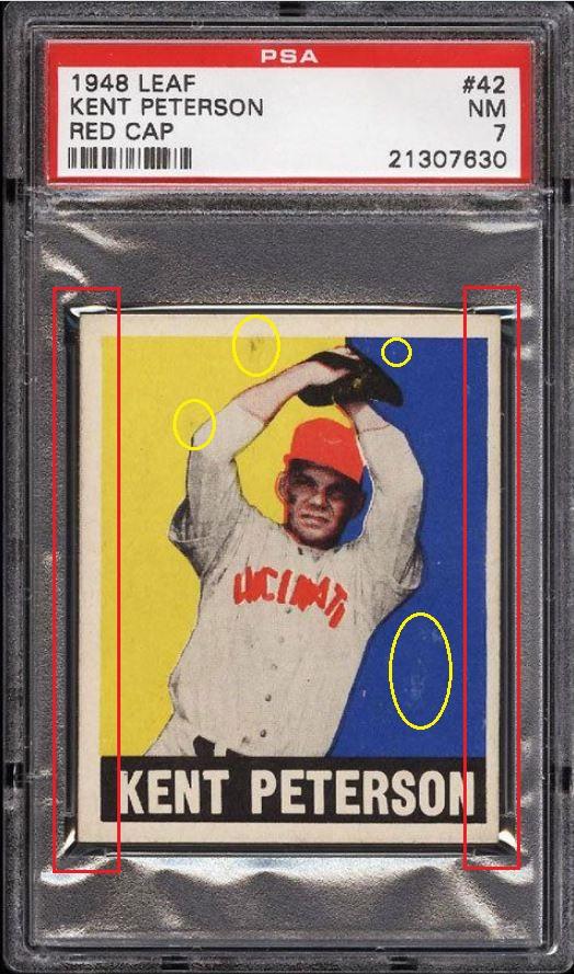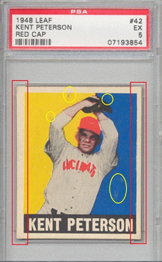 1948 Leaf Kent Peterson #42 (red cap) Value gain of $264.42 PSA Set Registry: private This card was purchased by whitman111 (Gary Moser) from Ebay seller iratherbedrivingmy1957chevy as a PSA 5 on March 20, 2013 for $129.58. Same card was sold by PWCC (Brent and Betsy Huigens) as a PSA 7 for $394.00 on December 10, 2017. Yellow circles are print, stain or fiber identifiers. Red squares identify trimmed left and right edges. No back image provided. ![]()