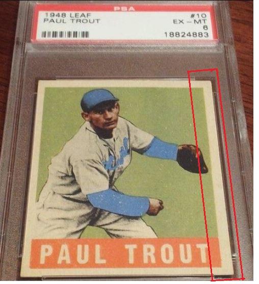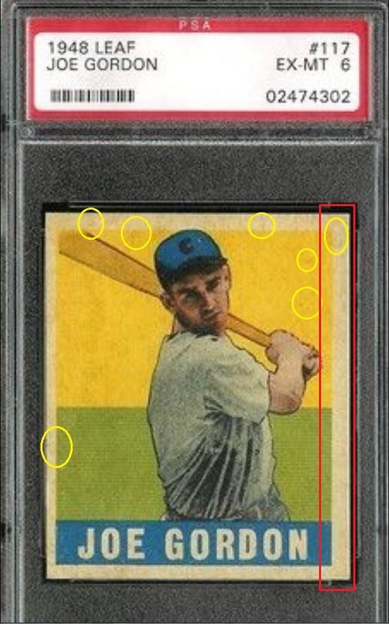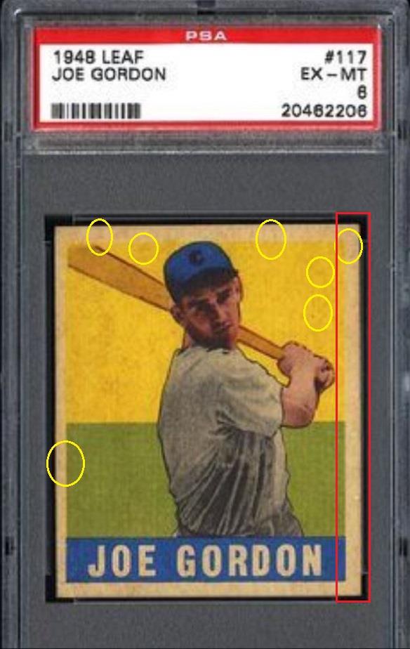 This trimmed card did not receive a grade bump. PSA Cert #20462206 1948 Leaf Joe Gordon #117 Value gain of $30.53 PSA Set Registry: none found This card was purchased by whitman111 (Gary Moser) from Ebay seller cardyman as a PSA 6 on June 10, 2012 for $56.55. Same card was sold by PWCC (Brent and Betsy Huigens) as a PSA 6 for $87.08 on October 08, 2012. Yellow circles are print, stain or fiber identifiers. Red square identifies trimmed right edge. No back image provided. ![]()