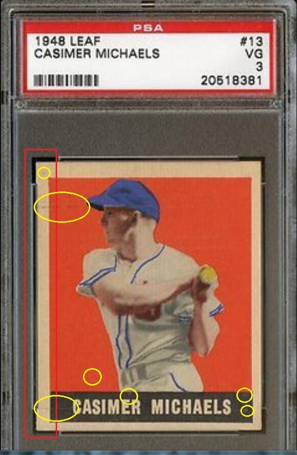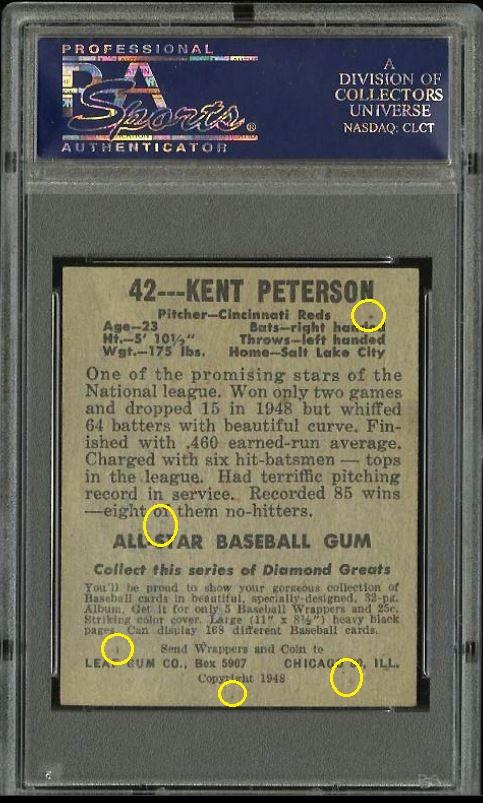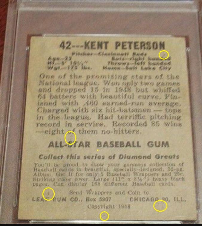 1948 Leaf Kent Peterson #42 (red cap) Value gain of $118.28 PSA Set Registry: private This card was purchased by whitman111 (Gary Moser) from Ebay seller 1948leaf-psa as a PSA 5 on July 31, 2013 for $54.99. Same card was sold by PWCC (Brent and Betsy Huigens) as a PSA 6 for $173.27 on February 14, 2014. Yellow circles are print, stain or fiber identifiers. Red squares identify trimmed left and right edges. ![]() ![]() ![]()