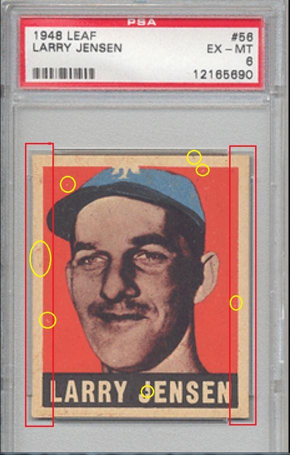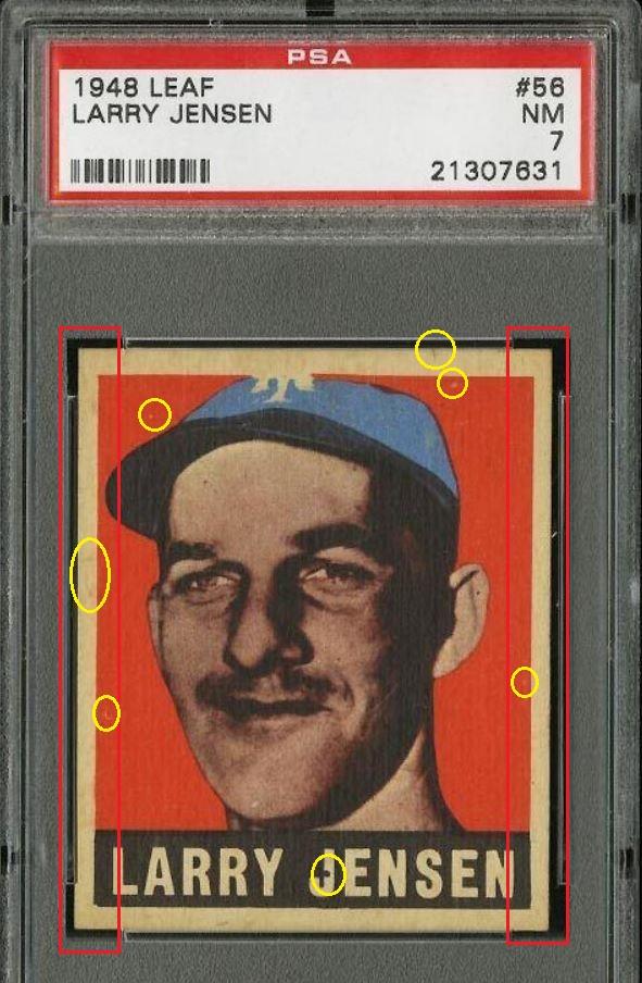 1948 Leaf Larry Jensen #56 Value gain of $59.23 PSA Set Registry: none found This card was purchased by whitman111 (Gary Moser) from Ebay seller iratherbedrivingmy1957chevy as a PSA 6 on April 07, 2013 for $28.77. Same card was sold by PWCC (Brent and Betsy Huigens) as a PSA 7 for $88.00 on March 30, 2014. Yellow circles are print, stain or fiber identifiers. Red squares identify trimmed left and right edges. No back image provided. ![]()