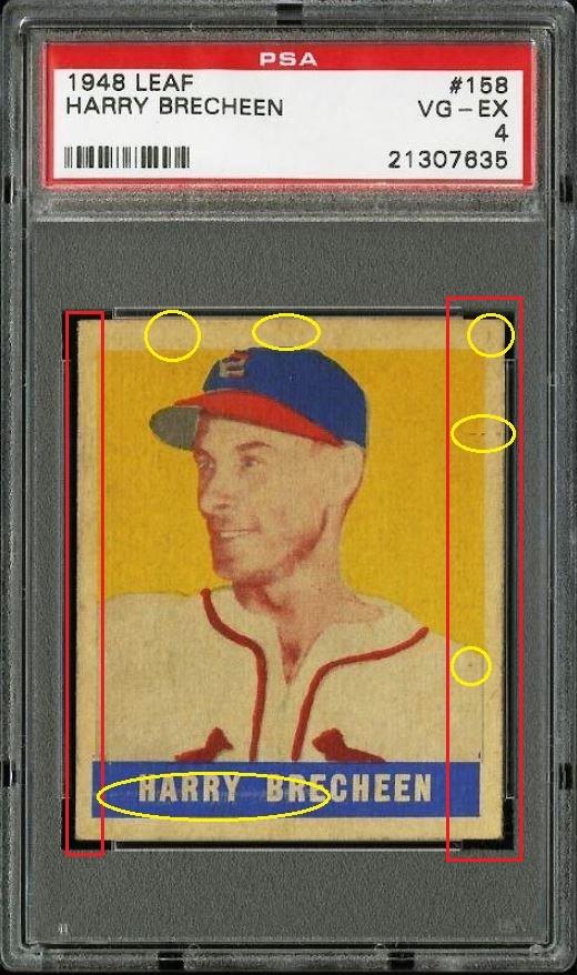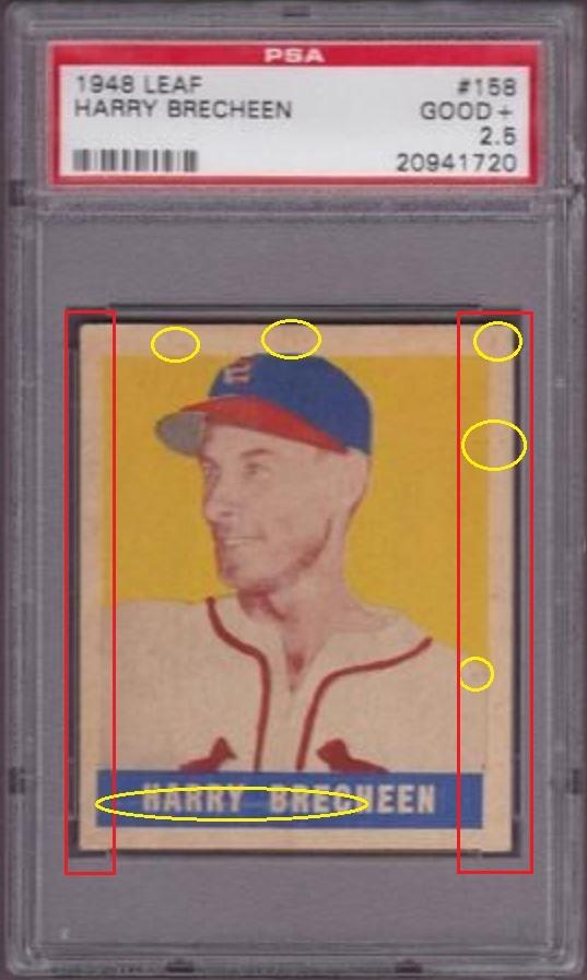Card sold as trimmed a second time in 2017 for $679.00. PSA Cert #21307635 1948 Leaf Harry Brecheen #158 (short print) Value gain of $5.00 PSA Set Registry: none found This card was purchased by whitman111 (Gary Moser) from Ebay seller shades-of-sport as a PSA 2.5 on March 25, 2013 for $222.50. Same card was sold by PWCC (Brent and Betsy Huigens) as a PSA 4 for $227.50 on August 07, 2013 and on February 07, 2017 for $679.00. Yellow circles are print, stain or fiber identifiers. Red squares identify trimmed left and right edges. Card is now not square. No back image provided. ![]()
