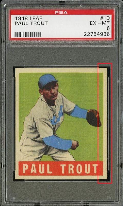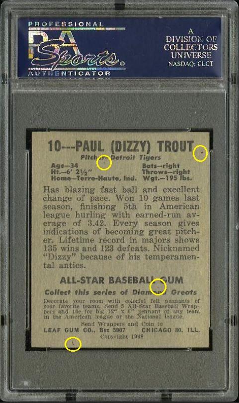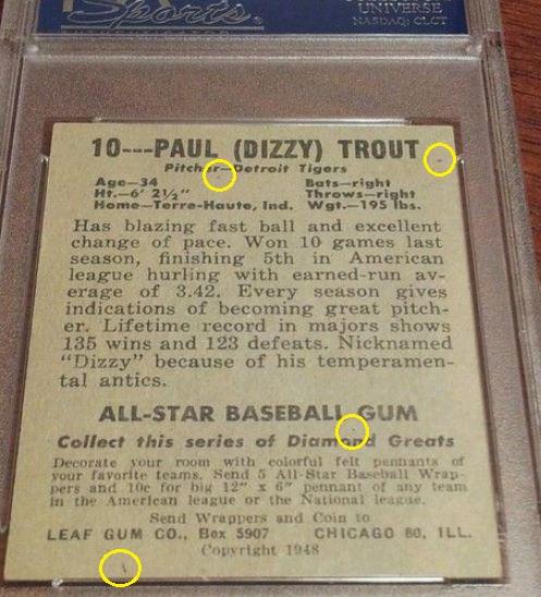 PSA Cert #22754986 1948 Leaf Paul 'Dizzy' Trout #10 Value gain of $4.91 PSA Set Registry: none found This card was purchased by whitman111 (Gary Moser) from Ebay seller 1948leaf-psa as a PSA 6 on October 11, 2013 for $28.77. Same card was sold by PWCC (Brent and Betsy Huigens) as a PSA 6 for $33.68 on October 05, 2014. Yellow circles are print, stain or fiber identifiers. Red square identifies trimmed right edge. ![]() ![]() ![]()