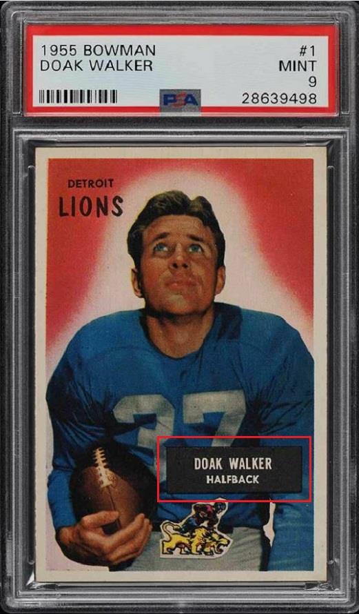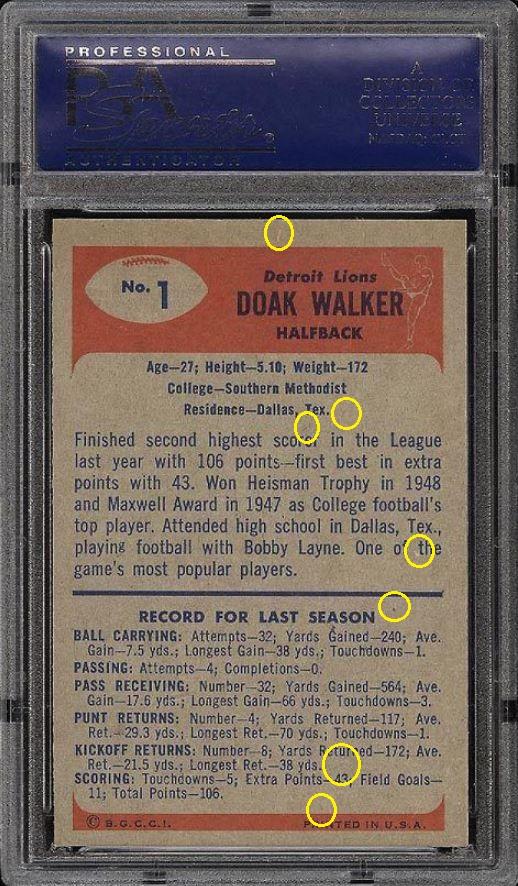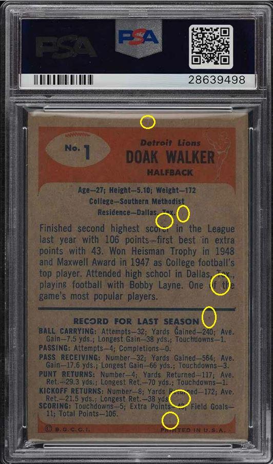 1955 Bowman Doak Walker #1 Value gain of $644.00 PSA Set Registry: private This card was purchased by whitman111 (Gary Moser) from Ebay seller PWCC as a PSA 8 on October 23, 2017 for $381.12. Same card was sold by PWCC (Brent and Betsy Huigens) as a PSA 9 for $1,025.00 on May 22, 2018. Yellow circles are print, stain or fiber identifiers. Red box identifies substantial recoloring. ![]() ![]() ![]() ![]() ![]()