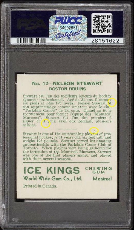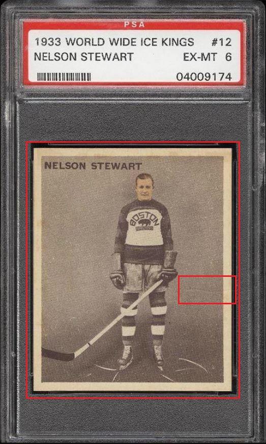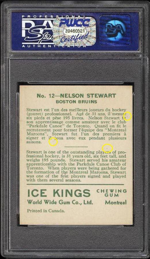 1933 World Wide Gum Ice Kings Nelson Stewart #12 Value gain of $1,626.00 PSA Set Registry: private This card was purchased by whitman111 (Gary Moser) from Ebay seller PWCC as a PSA 6 on February 23, 2016 for $449.00. Same card was sold by PWCC (Brent and Betsy Huigens) as a PSA 8 for $2,075.00 on December 19, 2017. Yellow circles are print, stain or fiber identifiers. Red box identifies crease removed and staining removed across the whole card. ![]() ![]() ![]()