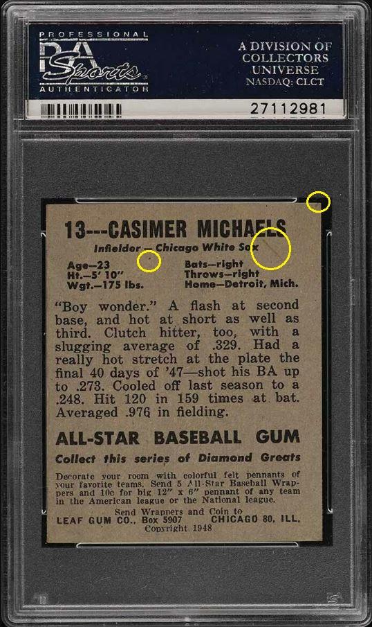 *Unknown buyer: Trimmed, graded lower and lost money. PSA Cert #27112981 1948 Leaf Casimer Michaels #13 Value LOSS of $150.71 PSA Set Registry: none found This card was purchased by an unknown buyer from Mile High Auctions as a PSA 6.5 on March 09, 2017 for $444.69. Same card was sold by PWCC (Brent and Betsy Huigens) as a PSA 6 for $293.98 on March 12, 2019. Yellow circles are print, stain or fiber identifiers. Red boxes identify trimmed left and right edges. ![]() ![]() ![]()