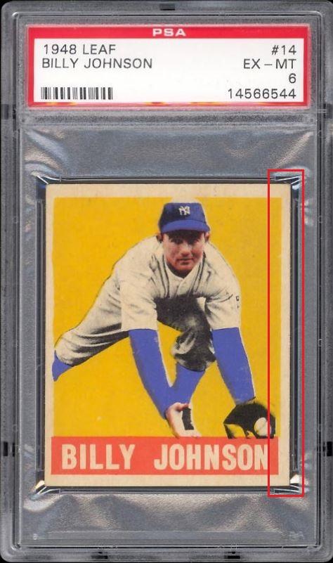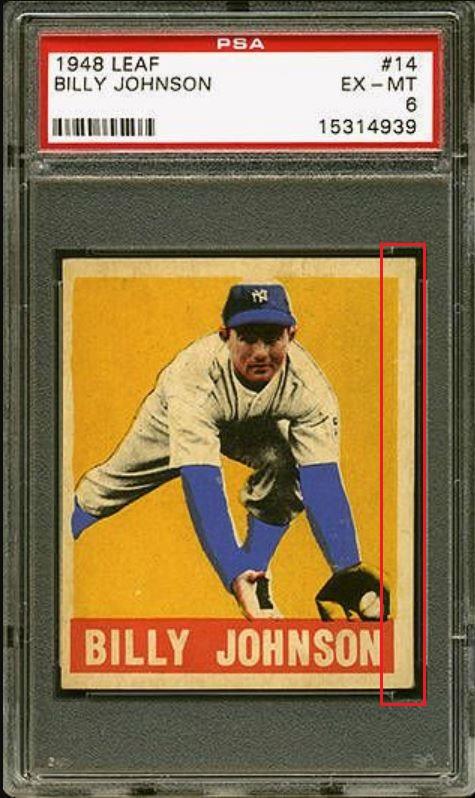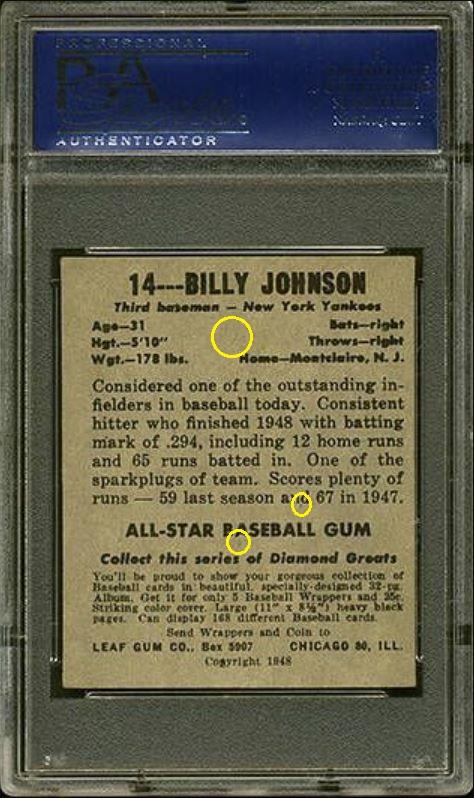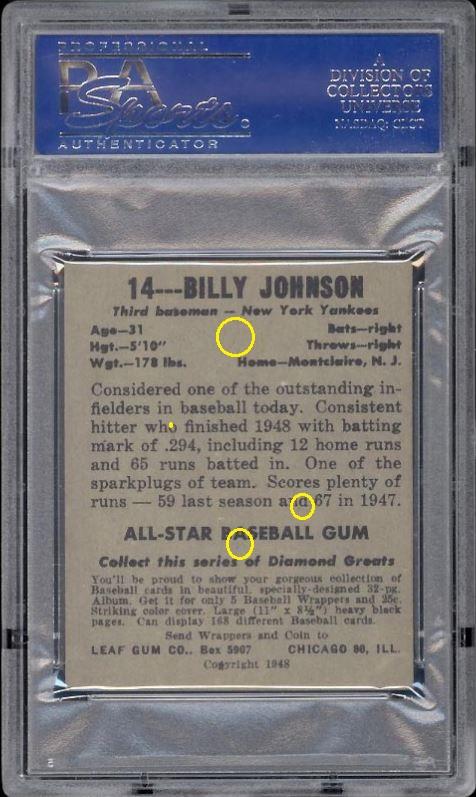 Trimmed with no grade change. PSA Cert #14566544 1948 Leaf Billy Johnson #14 Value gain of $20.00 PSA Set Registry: none found This card was purchased by Gary Moser (whitman111) from Ebay seller roomn8 as a PSA 6 on September 08, 2008 for $52.00. Same card was sold by PWCC (Brent and Betsy Huigens) as a PSA 6 for $72.00 on August 07, 2013. Yellow circles are print, stain or fiber identifiers. Red box identifies trimmed right edge. ![]() ![]() ![]()