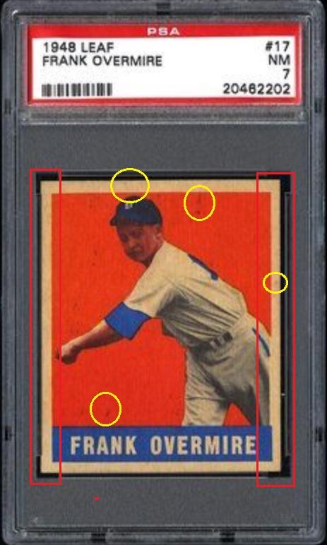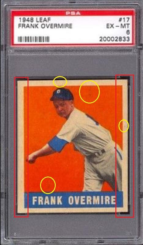 PSA Cert #15132939 1948 Leaf Frank Overmire #17 Value gain of $151.90 PSA Set Registry: none found This card was purchased by Gary Moser (whitman111) from Ebay seller mass35nyc as a PSA 6 on August 18, 2008 for $43.00. Same card was sold by PWCC (Brent and Betsy Huigens) as a PSA 8 for $195.90 on June 08, 2010. Yellow circles are print, stain or fiber identifiers. Red boxes identify trimmed left and right edges. No back image provided. You can see that it's the same card when you pay attention to the red streaks. ![]()