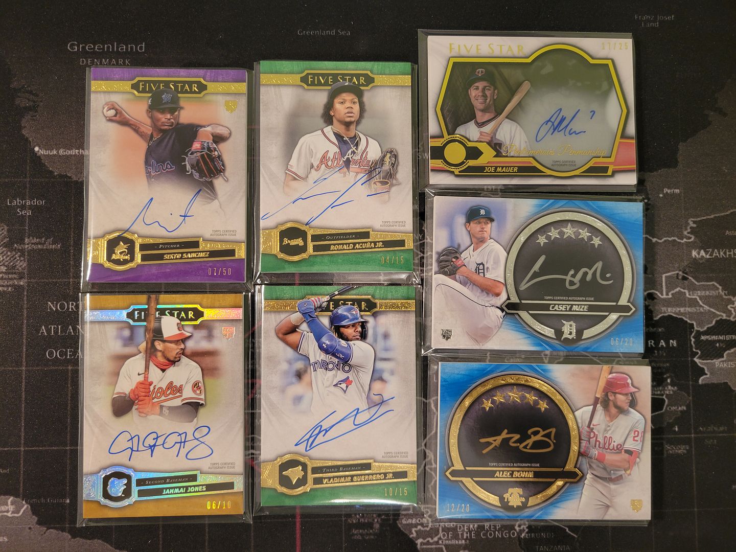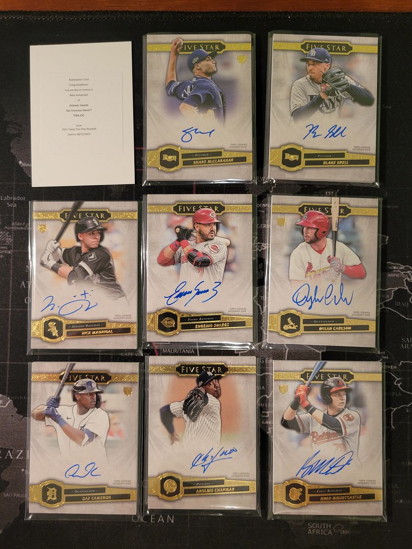 We are opening a full 8 box case. Each box has one pack and each pack contains two on-card autograph cards, unless replaced by a rare Five Stars Autograph or Cut Signature Card. So there are 15 spots. If we have 16 hits we will snake back around and the 15th spot will also get the 16th hit. If we only get 14 spots then I will refund anyone who didn't get a hit. Release date: October 20th, 2021 **************************************************************** Product Info: https://www.blowoutcards.com/2021-to...ase-18646.html Sell Sheet: http://www.blowoutcards.net/images/s...fivestarBB.pdf *************************************************************** Rules: 1. All randomizations will be done live and will be recorded via ustream by myself or a blowout moderator. Lists will be randomized 5x. I may participate in the break, so please be aware of this before joining. 2. All items >$250 will require additional payment for insurance. 3. Do not buy/sell/trade to members that are not in the break. 4. Payments for this break will be due within 48 hours of when payments are due to lock down product. 5. I have the right to decide who can participate in the break based on past participation or from the advice of other breakers/mods on the forum. ************************************************************ Pricing: 1,954.95 per case + pp fees, supplies, shipping /15 spots = $141 per spot ************************************************************** Official Draft Order: 1. TKCards (1) - Ronald Acuna Jr Green Auto 04/15 2. GardnerMotors - Vladimir Guerrero Jr Green Auto 10/15 3. jagrwildfan - Alec Bohm Gold Five Star Auto 12/20 4. Doodlegrass (1) - Joe Mauer Pentamerous Penmanship Auto 07/25 5. VinnyH (2) - Aroldis Chapman Base Auto 6. VinnyH - Ryan Mountcastle Base Auto 7. jagrwildfan (3) - Casey Mize Silver Five Star Auto 06/20 8. nearmouse - Nick Madrigal Base Auto 9. Oreo2004 (1) - Jahmai Jones Gold Auto 06/10 10 bcbsmartass (1) - Dylan Carlson Base Auto 11. GardnerMotors (2) - Shane McClanahan Base Auto 12. jagrwildfan - Sixto Sanchez Purple Auto 07/50 13. Cregermax (1) - Blake Snell Base Auto 14. SIUSlater88 (1) - Daz Cameron Base Auto 15. notsublime (1) - Orlando Cepeda Base Auto Redemption *snake* 16. notsublime (1) - Eugenio Suarez Base Auto https://youtu.be/5FnNWGobp0w Pics: ![]()