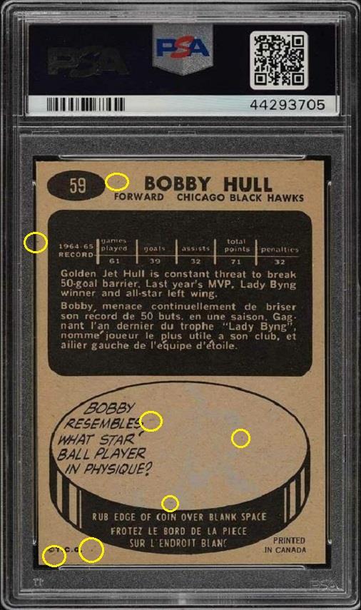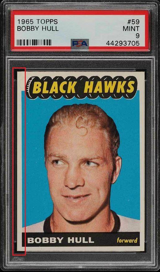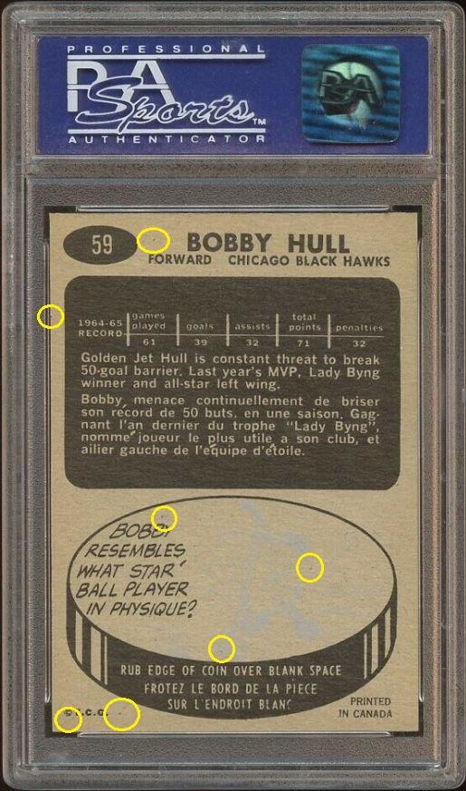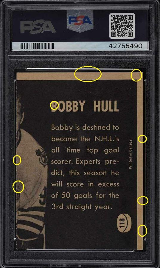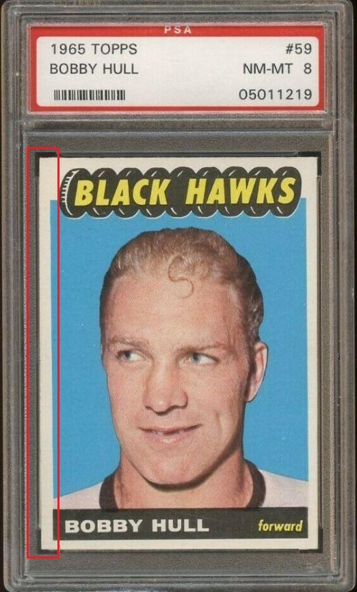 1965 Topps Bobby Hull #59 Value gain of $184.01 Set Registry: Sportcardguy This card was purchased by masked Ebay ID e***c (irvinecardco) from Ebay seller gregmorriscards as a PSA 8 for $216.50 on March 04, 2019. Same card was sold by PWCC (Brent and Betsy Huigens) as a PSA 9 for $400.51 on November 24, 2019. Yellow circles are print, fiber, or chipping identifiers. Red box identifies trimmed left edge. ![]() ![]() ![]()