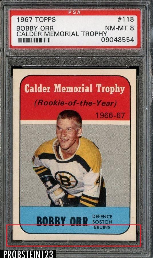 1967 Topps Bobby Orr #118 Value gain of $378.69 PSA Set Registry: Jet This card was purchased by Ebay ID irvinecardco from Ebay seller probstein123 as a PSA 8 for $316.31 on August 30, 2018. Same card was sold by PWCC (Brent and Betsy Huigens) as a PSA 8.5 for $695.00 on January 26, 2021. Yellow circles are print, fiber, or chipping identifiers. Red box identifies trimmed bottom edge. ![]() ![]() ![]() ![]() ![]() ![]()