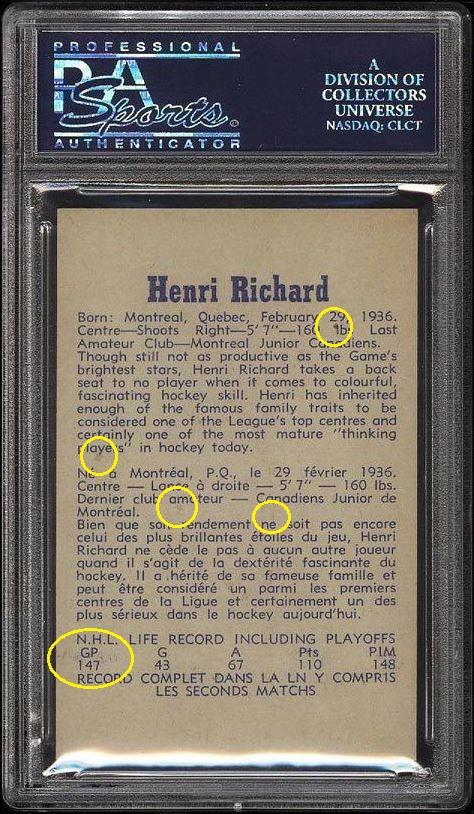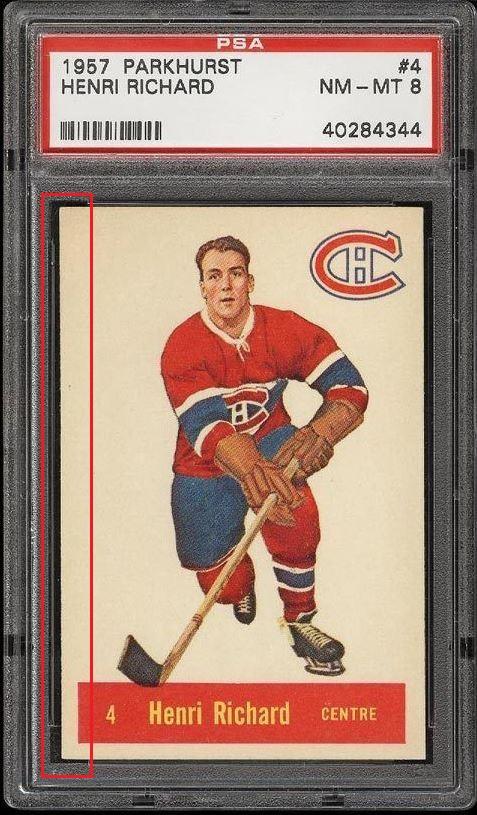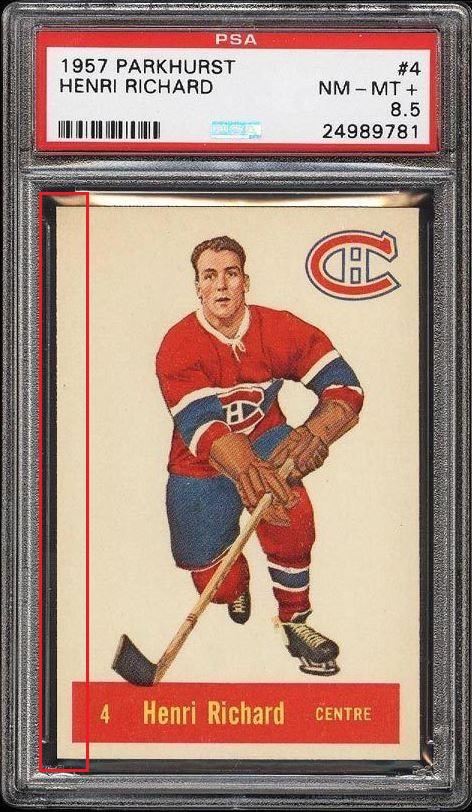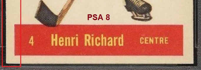 1957 Parkhurst Henri Richard #4 Value gain of $1,500.92 PSA Set Registry: The Dumais Collection - 57 Mtl Parkies This card was purchased by Ebay ID card-buyer from Ebay seller PWCC as a PSA 8 for $3,427.07 on March 18, 2015. Same card was sold by PWCC (Brent and Betsy Huigens) as a PSA 8.5 for $4,927.99 on December 20, 2015. Yellow circles are print, fiber, or chipping identifiers. Red box identifies trimmed left edge. ![]() ![]() ![]() ![]() ![]() ![]()