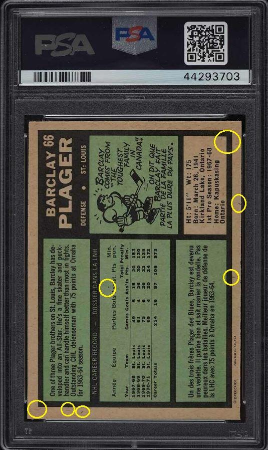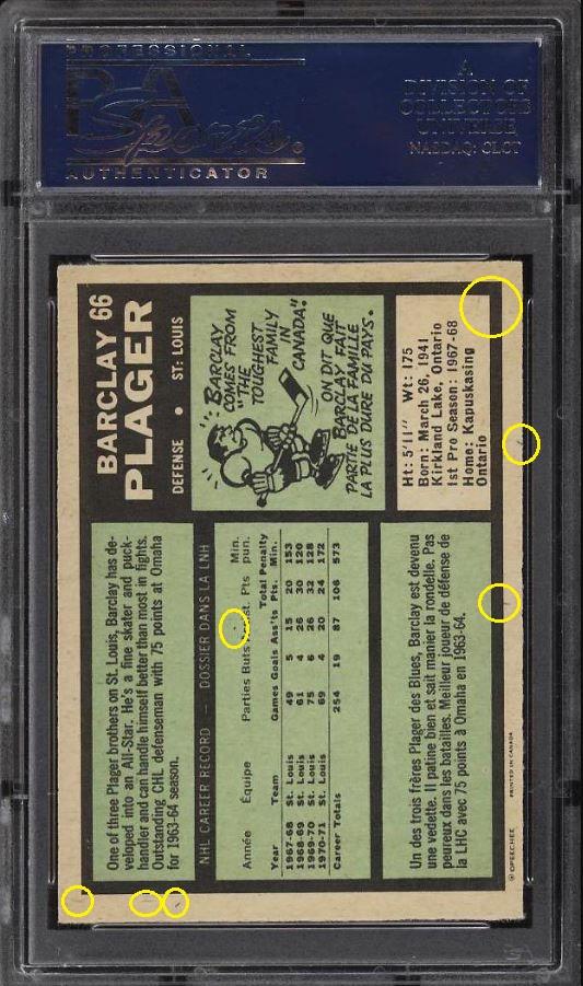 The cert #'s that begin with 442 were sold by PWCC after they were outed as trimmers. PSA Cert #44293703 1971 O-Pee-Chee Barclay Plager #66 Value gain of $67.44 Set Registry: none This card was purchased by masked Ebay ID e***c (irvinecardco) from Ebay seller PWCC as a PSA 8.5 for $8.00 on October 28, 2018. Same card was sold by PWCC (Brent and Betsy Huigens) as a PSA 9 for $75.44 on January 26, 2021. Yellow circles are print, fiber, or chipping identifiers. Red box identifies trimmed bottom edge. ![]() ![]() ![]() ![]() ![]()