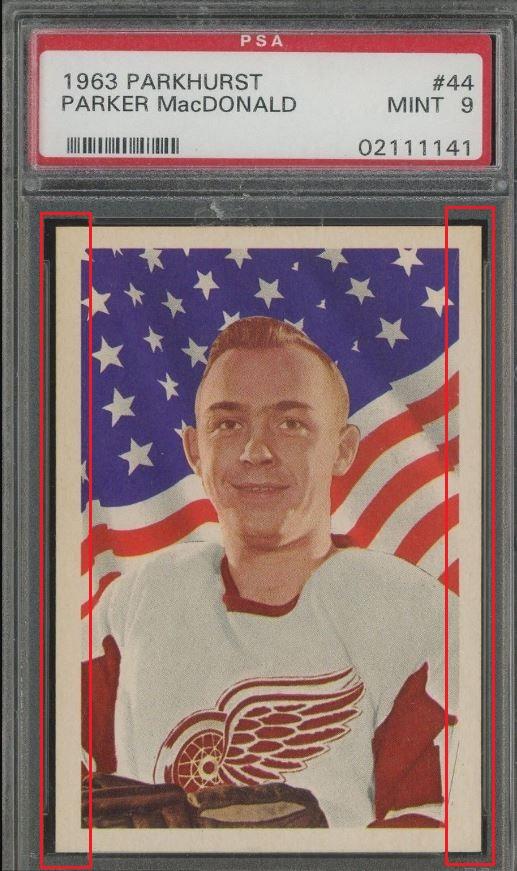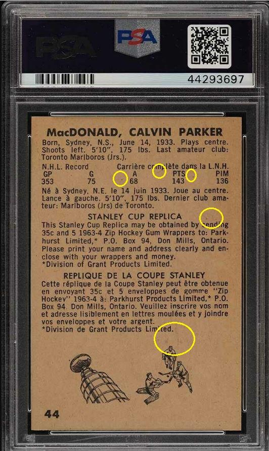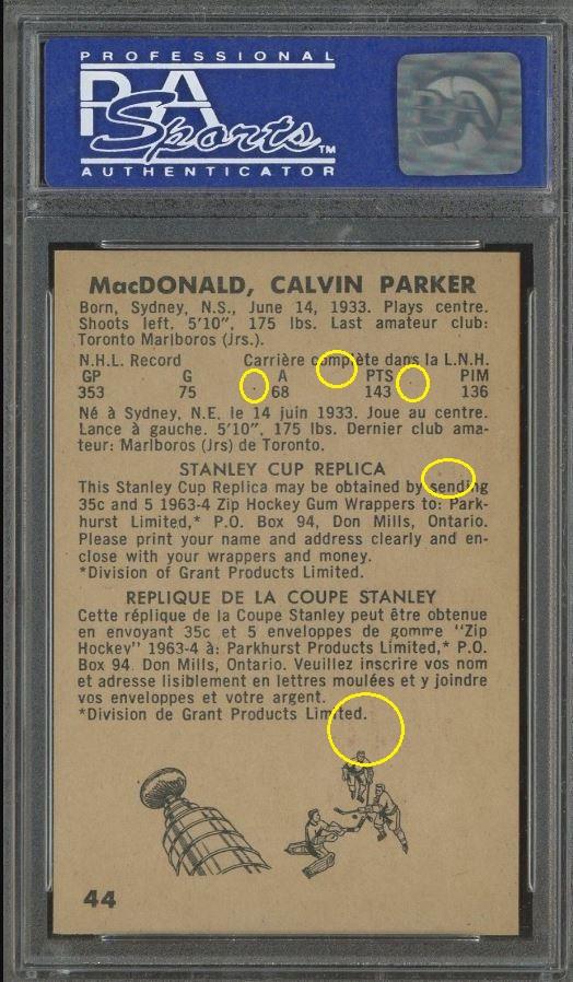 1963 Parkhurst Parker Macdonald #44 Value gain of $216.00 Set Registry: TheSpiffDog This card was purchased by masked Ebay ID e***c (irvinecardco) from Ebay seller kyshasports as a PSA 9 for $85.00 on March 29, 2019. Same card was sold by PWCC (Brent and Betsy Huigens) as a PSA 10 for $301.00 on November 24, 2019. Yellow circles are print, fiber, or chipping identifiers. Red boxes identify trimmed left and right edges. I uses scans of the PSA 9 from an earlier sale which were sharper. ![]() ![]() ![]() ![]() ![]()