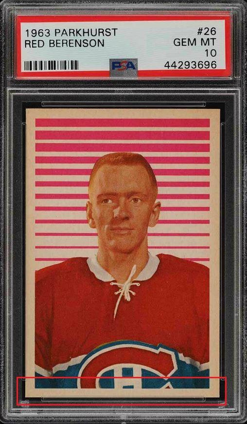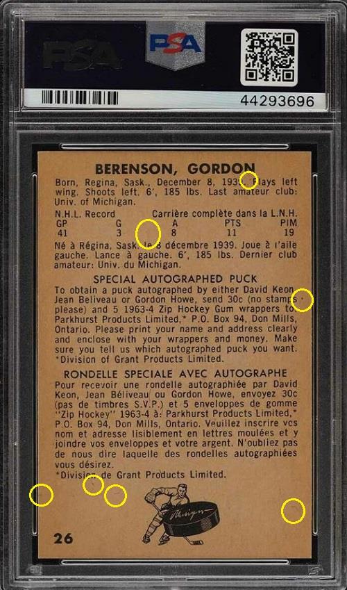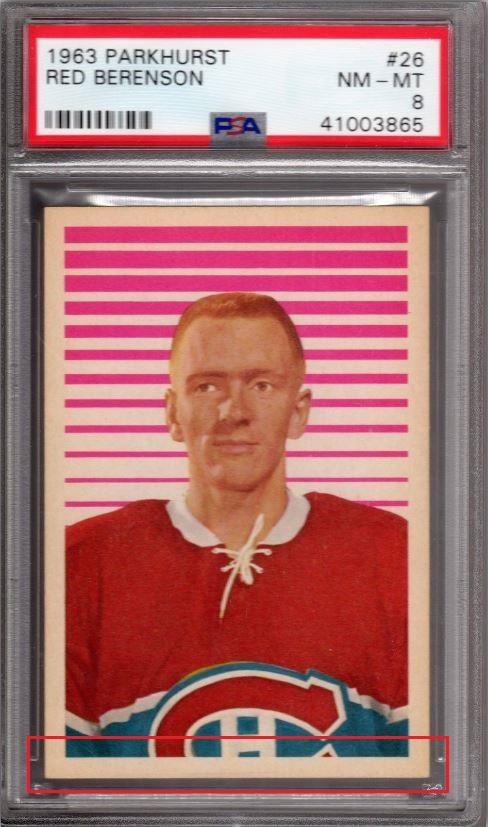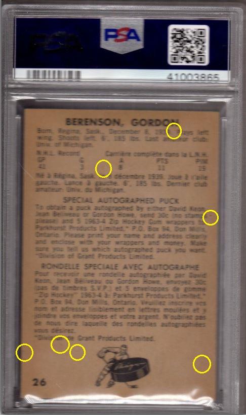 1963 Parkhurst Red Berenson #26 Value gain of $478.01 Set Registry: TheSpiffDog This card was purchased by masked Ebay ID e***c (irvinecardco) from Ebay seller kyshasports as a PSA 8 for $74.99 on March 27, 2019. Same card was sold by PWCC (Brent and Betsy Huigens) as a PSA 10 for $553.00 on November 24, 2019. Yellow circles are print, fiber, or chipping identifiers. Red box identifies trimmed bottom edge. kyshasports uses awful scans yet I was still able to confirm it's the same card. ![]() ![]() ![]() ![]() ![]()