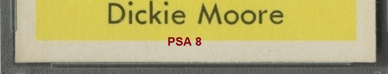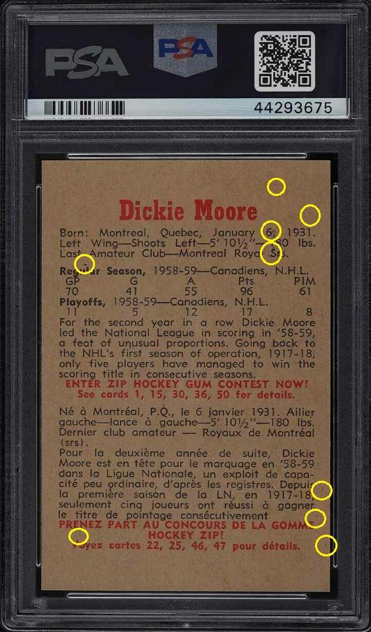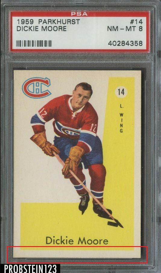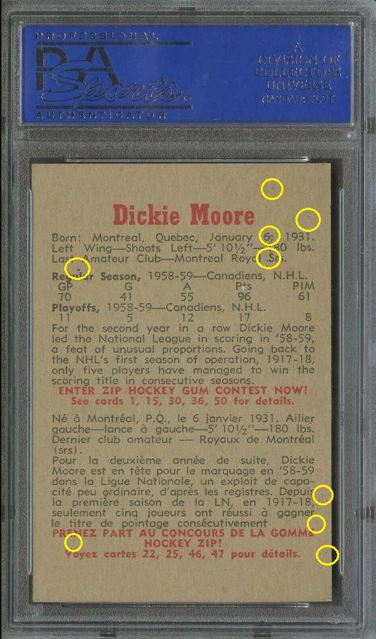 1959 Parkhurst Dickie Moore #14 Value gain of $1,426.00 Set Registry: Steve’s 59 set This card was purchased by masked Ebay ID e***c (irvinecardco) from Ebay seller probstein123 as a PSA 8 for $61.00 on May 16, 2019. Same card was sold by PWCC (Brent and Betsy Huigens) as a PSA 10 for $1,487.00 on January 26, 2021. Yellow circles are print, fiber, or chipping identifiers. Red box identifies trimmed bottom edge. The left and right edges are also trimmed. ![]() ![]() ![]() ![]() ![]() ![]()