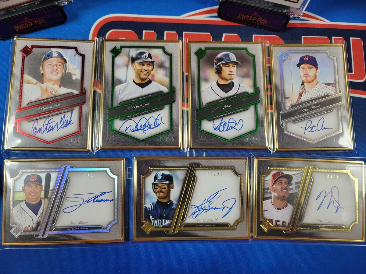 Aaron Judge 10/15 Adrian Beltre 16/20 Albert Pujols 8/10 Alec Bohm 11/20 Alex Bregman 13/15 Andrew McCutchen 02/20 Barry Larkin 7/15 Bo Jackson 09/10 Bryce Harper 03/20 Cal Ripken 17/20 Carlton Fisk 1/1 Carl Yastresmski 07/20 Chipper Jones 04/15 Christian Yelich 20/20 Corey Seager 14/20 Dave Winfield 06/20 Derek Jeter 13/15 Don Mattingly 18/20 Dylan Carlson 15/15 Eddie Murray 05/20 Frank Thomas 02/15 George Springer 08/15 Greg Maddux 05/10 Hideki Matsui 09/10 Ichiro 03/15 Jim Thome 1/1 Joey Votto 11/15 Johnny Bench 07/15 John Donaldson 11/20 KeBryan Hayes 01/15 Ken Griffey Jr 03/20 Manny machado 01/20 Mark McGwire 19/10 Miguel Cabrera 08/10 Mike Schmidt 02/20 Mike Trout 16/20 Nolan Arenado 01/10 Nolan Ryan 15/20 Nomar Garciaparra 04/20 Paul Goldschmidt 10/20 Pedro Martinez 06/10 Pete Alonso 1/1 Randy Johnson 03/10 Reggie jackson 08/20 Rickey Henderson 05/15 Roger Clemens 04/10 Ryne Sandberg 03/20 Vladimir Guerrero 09/20 Wade Boggs 07/15 Yordan Alvarez 02/10 Roger Clemens 1/1 Juan Soto 1952 1/1 Fernando Tatis Patch 1/1 Barry Larkin Patch 1/1 Eddie Murray Superfractor Wright Bros Dual Cut