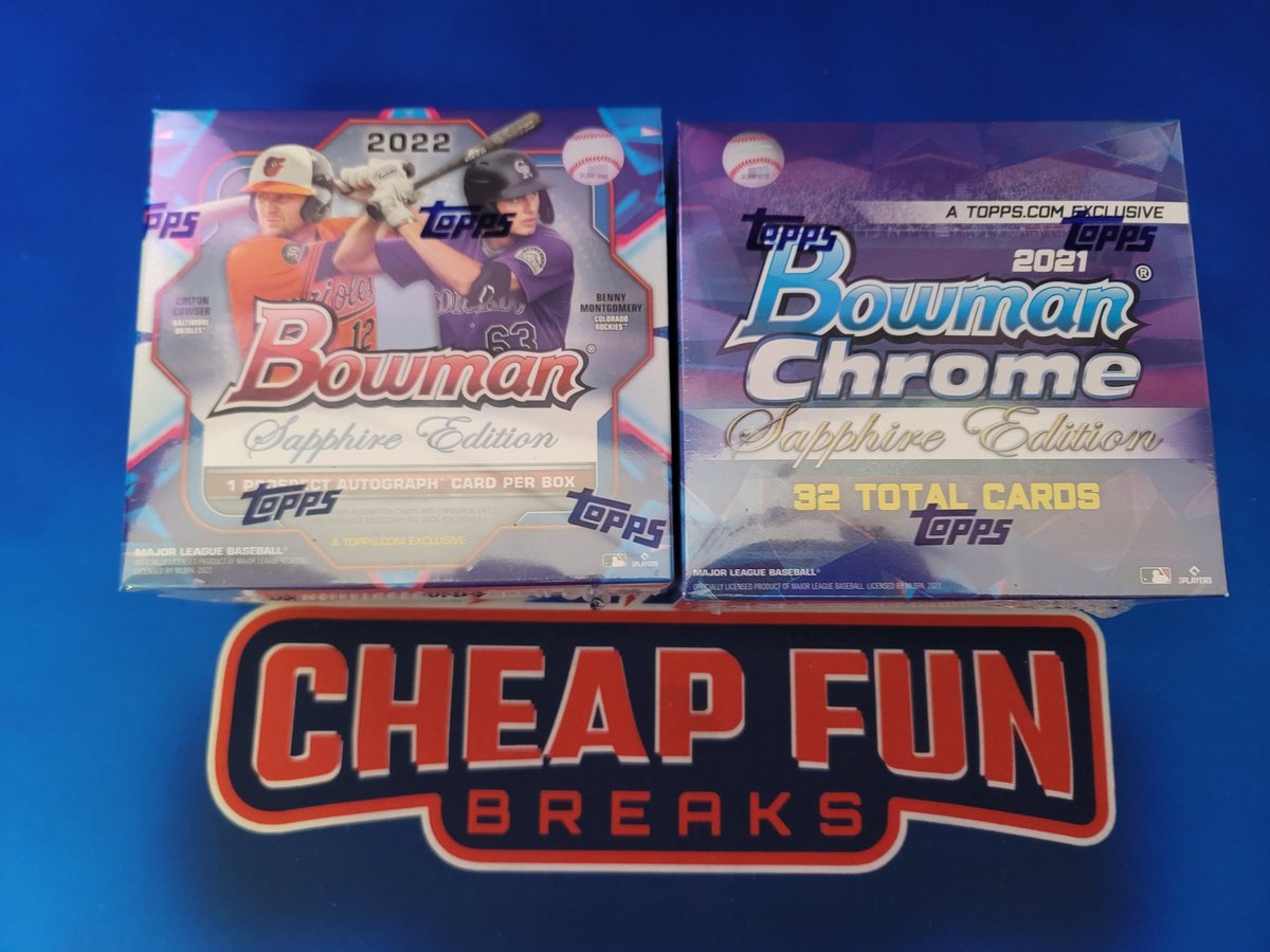 25 boxes of 2022 Bowman Sapphire 200 spots. 1 spot from each checklist. It is possible for an auto spot not to hit. We will random the participation list x3 and match that with the two 200 card checklists. You get 1 random spot from each. All color will be sleeved and toploaded - base sapphire will be bagged. (We will continue to sleeve/topload some of the top names but that's not promised ok?) Payment instructions: 1. Add your username in the box provided before clicking button. 2. Log in to paypal to use your account normally OR stay logged out to use button as guest & use a credit card. 3. MAKE SURE YOUR ADDRESS IS CORRECT. I absolutely MUST ship to the address attached to your payment from paypal. 4. No refunds or returns, sorry. 5. No echecks. In the event of an echeck, it will have to clear in 3-5 days and then be refunded. You get 1 random name from each list: 2021 Bowman Chrome Sapphire BCP-151 Victor Acosta 1st BCP-152 Logan Gilbert BCP-153 Kevin Made 1st BCP-154 Helcris Olivarez 1st BCP-155 Reid Detmers BCP-156 Jordyn Adams BCP-157 Shea Langeliers BCP-158 Kristian Robinson BCP-159 Alek Thomas BCP-160 Drew Waters BCP-161 Julio Carreras 1st BCP-162 Braden Shewmake BCP-163 Maximo Acosta BCP-164 Drew Romo BCP-165 Grayson Rodriguez BCP-166 Heston Kjerstad BCP-167 Miguel Bleis BCP-168 Triston Casas BCP-169 Jeter Downs BCP-170 Jarren Duran BCP-171 Cristian Hernandez 1st BCP-172 Gabriel Arias BCP-173 Brennen Davis BCP-174 Jared Kelley BCP-175 Hunter Greene BCP-176 Yoelqui Cespedes BCP-177 Austin Hendrick BCP-178 Nick Lodolo BCP-179 Alexander Mojica 1st BCP-180 Gabriel Rodriguez 1st BCP-181 Jeferson Quero 1st BCP-182 Tyler Freeman BCP-183 Zac Veen BCP-184 Malvin Valdez BCP-185 Michael Toglia BCP-186 Cristian Santana 1st BCP-187 Spencer Torkelson BCP-188 Riley Greene BCP-189 Pedro Leon 1st BCP-190 Jeremy Pena BCP-191 Eduardo Garcia 1st BCP-192 Miguel Amaya BCP-193 Bobby Witt Jr. BCP-194 Asa Lacy BCP-195 Blaze Jordan BCP-196 Luis Rodriguez 1st BCP-197 Wilman Diaz 1st BCP-198 Josiah Gray BCP-199 Yiddi Cappe 1st BCP-200 JJ Bleday BCP-201 Max Meyer BCP-202 Luis Medina 1st BCP-203 Hedbert Perez BCP-204 Garrett Mitchell BCP-205 Matt Manning BCP-206 Misael Urbina 1st BCP-207 Emmanuel Rodriguez 1st BCP-208 Alexander Ramirez 1st BCP-209 Francisco Alvarez BCP-210 Ronny Mauricio BCP-211 Matthew Allan BCP-212 Alexander Vizcaino 1st BCP-213 Jasson Dominguez BCP-214 Austin Wells BCP-215 Milkar Perez 1st BCP-216 Pedro Pineda 1st BCP-217 Tyler Soderstrom BCP-218 Robert Puason BCP-219 Mick Abel BCP-220 Oswald Peraza BCP-221 Ed Howard BCP-222 Shalin Polanco 1st BCP-223 Po-Yu Chen 1st BCP-224 Nick Gonzales BCP-225 Robert Hassell BCP-226 Malcom Nunez 1st BCP-227 CJ Abrams BCP-228 Luis Toribio 1st BCP-229 Marco Luciano BCP-230 Patrick Bailey BCP-231 Julio Rodriguez BCP-232 Gilberto Celestino 1st BCP-233 Emerson Hancock BCP-234 Matthew Liberatore BCP-235 Nolan Gorman BCP-236 Jordan Walker BCP-237 Brett Baty BCP-238 Carlos Colmenarez 1st BCP-239 Jhonny Piron 1st BCP-240 Wander Franco BCP-241 Adley Rutschman BCP-242 Justin Foscue BCP-243 Nick Yorke BCP-244 Manuel Beltre 1st BCP-245 Austin Martin BCP-246 Jordan Groshans BCP-247 Armando Cruz 1st BCP-248 Jeremy De La Rosa BCP-249 Starlin Aguilar 1st BCP-250 Cade Cavalli 1 Bobby Dalbec RC 2 Joey Votto 3 Alex Kirilloff RC 4 Jose Abreu 5 Andrew Vaughn RC 6 Triston McKenzie RC 7 Nick Madrigal RC 8 Shane McClanahan RC 9 Casey Mize RC 10 Vladimir Guerrero Jr. 11 Ronald Acuña Jr. 12 Andres Gimenez RC 13 Tanner Houck RC 14 Jose Garcia RC 15 Charlie Blackmon 16 Yu Darvish 17 Nate Pearson RC 18 J.T. Realmuto 19 Jose Ramirez 20 Fernando Tatis Jr. 21 Jesus Luzardo 22 Christian Yelich 23 Joey Bart RC 24 Jose Altuve 25 Aaron Judge 26 Yordan Alvarez 27 Shohei Ohtani 28 Tarik Skubal RC 29 Ke’Bryan Hayes RC 30 Shane Bieber 31 Buster Posey 32 Austin Hays 33 Clarke Schmidt RC 34 Akil Baddoo RC 35 Jesus Sanchez RC 36 Eugenio Suarez 37 Luis Campusano RC 38 William Contreras RC 39 Luis Arraez 40 Keston Hiura 41 Pete Alonso 42 Jo Adell RC 43 Brady Singer RC 44 Miguel Cabrera 45 Dylan Carlson RC 46 Paul Goldschmidt 47 Jorge Soler 48 Ketel Marte 49 Alejandro Kirk RC 50 Gleyber Torres 51 Josh Donaldson 52 Whit Merrifield 53 Javier Baez 54 Mike Trout 55 Deivi Garcia RC 56 Ryan Jeffers RC 57 Jazz Chisholm RC 58 J.D. Martinez 59 Spencer Howard RC 60 George Springer 61 Taylor Trammell RC 62 Luis Patiño RC 63 Garrett Crochet RC 64 Ryan Mountcastle RC 65 Kevin Newman 66 Randy Arozarena 67 Nolan Arenado 68 Jake Cronenworth RC 69 Cristian Pache RC 70 Keibert Ruiz RC 71 Kyle Lewis 72 Austin Meadows 73 Matt Chapman 74 Luis Garcia RC 75 Dane Dunning RC 76 Ian Anderson RC 77 Max Scherzer 78 Sixto Sanchez RC 79 Mike Yastrzemski 80 Cristian Javier RC 81 Francisco Lindor 82 Joey Gallo 83 Freddie Freeman 84 Juan Soto 85 Xander Bogaerts 86 Mookie Betts 87 Tyler Stephenson RC 88 Yermin Mercedes RC 89 Cody Bellinger 90 Luis Robert 91 Sam Huff RC 92 Bryan Reynolds 93 Kris Bryant 94 Alec Bohm RC 95 Daulton Varsho RC 96 Bryce Harper 97 Ha-Seong Kim RC 98 Geraldo Perdomo RC 99 Yadier Molina 100 Brailyn Marquez RC 2022 Bowman Sapphire (There are auto and non-auto spots. BCP = non auto & BSPA = auto only) BCP-1 Carlos Aguiar 1st BCP-2 Jhonkensy Noel 1st BCP-3 Kahlil Watson 1st BCP-4 Misael Gonzalez 1st BCP-5 Brett Baty BCP-6 Spencer Torkelson BCP-7 Marco Luciano BCP-8 Benyamin Bailey 1st BCP-9 CJ Abrams BCP-10 Curtis Mead 1st BCP-11 Dauri Lorenzo 1st BCP-12 Estiven Machado 1st BCP-13 Zac Veen BCP-14 Roberto Campos 1st BCP-15 Branlyn Jaraba 1st BCP-16 Ronny Mauricio BCP-17 Oswaldo Cabrera 1st BCP-18 Alvin Guzman 1st BCP-19 Adrian Sugastey 1st BCP-20 Jordan Walker BCP-21 Jose Pastrano 1st BCP-22 George Valera 1st BCP-23 Elijah Tatis 1st BCP-24 Jorbit Vivas 1st BCP-25 Rikelvin De Castro BCP-26 Anthony Rodriguez 1st BCP-27 Darell Hernaiz 1st BCP-28 Brandon Valenzuela 1st BCP-29 Adley Rutschman BCP-30 Jose Salas BCP-31 Kevin Alcantara BCP-32 Euribiel Angeles 1st BCP-33 Austin Hendrick BCP-34 Liover Peguero BCP-35 H
