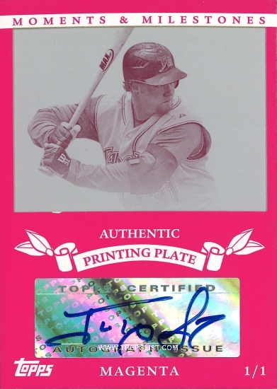 The first is a 2007 Topps Moments & Milestones signed magenta printing plate—it’s one of 16 signed Gomes 1/1s (I now have 8 of them), and joins the yellow, which I already had. The second is a 2009 Topps Updates & Highlights magenta printing plate—it joins the cyan and yellow, leaving me missing only the black. All told, this takes me to 136/305 1/1s—44.6%, and 17 away from reaching the midway point. ![]()