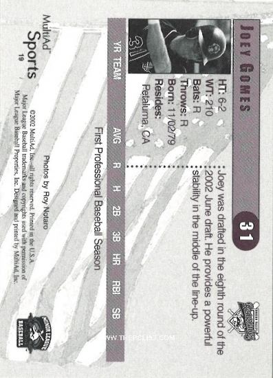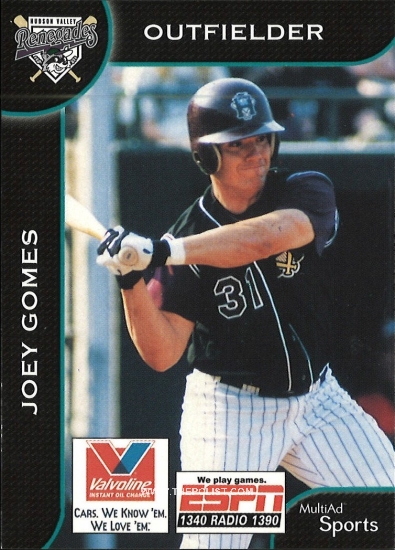 Thanks, green4407! Here's another Petaluma boy: Jonny Gomes's older brother, Joey. Took me years to find this card—a stadium giveaway that, other than the Valvoline/ESPN Radio logos (presumably the sponsors of the giveaway) is identical to the regular Multi-Ad set for that year. Finally arrives yesterday. It leaves me missing only two of Joey Gomes's 79 non-1/1 cards: