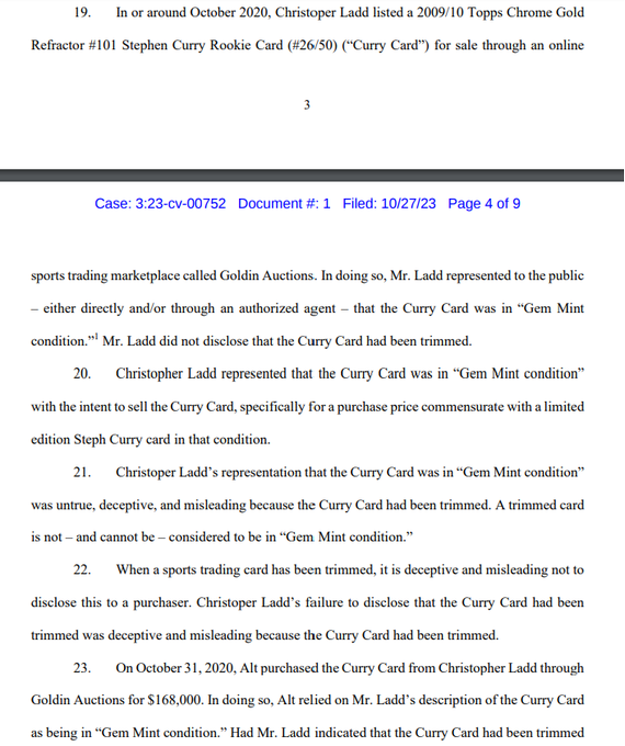 No news on the Beckett case but similarly to what was alleged in the referenced thread blowout deleted, it appears ALT might be following their founders tactics and again going after the grading company and the alleged seller of the Curry.