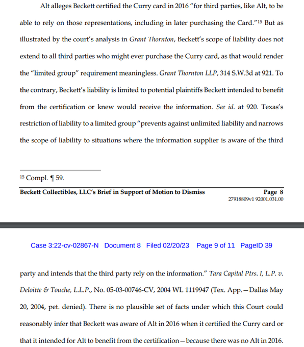 Beckett's argument is legally ridiculous and should be found by the court as such if the court can grasp the context here. How can Beckett ever be aware of who the third party is beyond who the submitter of the card is? And except in the case of Beckett intentionally harming the submitter by fraudulently lowering the grade of the card submitted, the submitter can not be harmed by the grade assigned by Beckett. The issue at hand here is that Beckett assigned an erroneously high grade, thus benefitting the third party submitter.