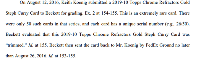 https://twitter.com/Paul_Lesko/statu...180311040?s=20 Rather than focus on the alleged removal of the card from the case, Beckett appears to be trying to dismiss the case by suggesting they're not liable for the assigned grade, as the grading occurred prior to ALT's existence.