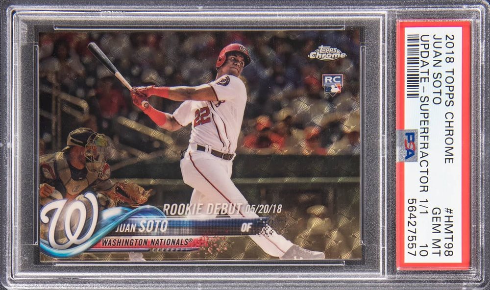 2018 TCU HMT98 Juan Soto Rookie Debut Superfractor PSA-10 https://ebay.com/itm/387180768957 https://www.psacard.com/auctionprice...auction/578375 $39,600 (April 9, 2022): https://goldin.co/item/2018-topps-ch...-card-1-1esvbw