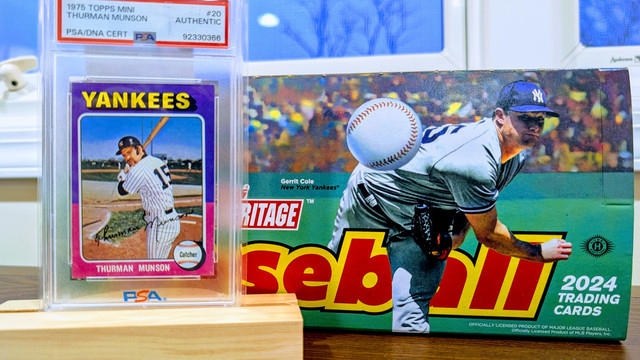 ![]() ![]() I am trying to display a few key cards from my collection with their corresponding wax box/packaging. I feel this creates more interest than a simple row of slabs. This Heritage box will have to do until I can get an empty 1975 Topps box to complement this. Although as a Yankee fan, I don't mind having Cole over the Mets pitcher (?Seaver) who graces the 1975 packaging.