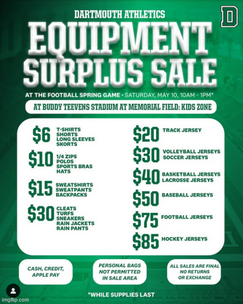 equipment sale happens every few years, and the new admin. has completely raised prices this time. used to buy 3-4 hockey jerseys every sale of players i knew. they used to be $25, they are now...