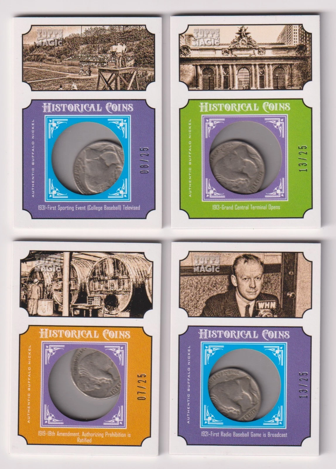 Very cool relic cards contain an actual Buffalo nickel; comemorating early 20th century events, Each card limited to /25 produced.