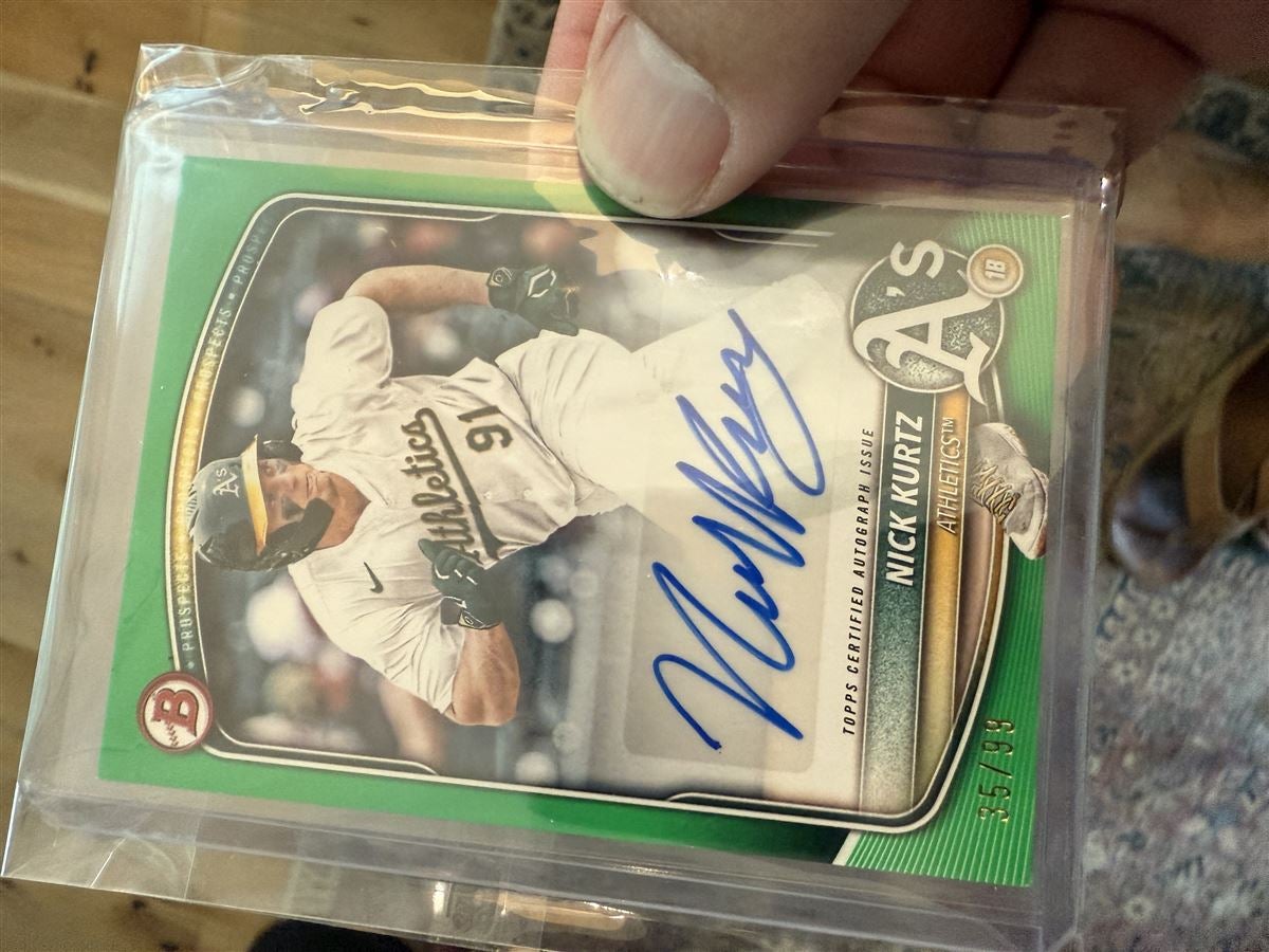![]() Pulled a paper bowman green auto /99 last week from a last-on-the-shelf Bowman blaster. Timely pull it seems Last edited by JHVS123; 07-26-2025 at 05:12 AM. |