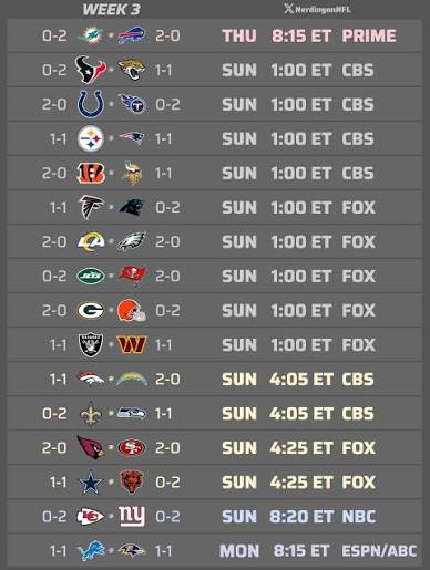 Thursday, Sept. 18, 2025 Miami Dolphins at Buffalo Bills 8:15p (ET) 8:15p Prime Video Sunday, Sept. 21, 2025 Atlanta Falcons at Carolina Panthers 1:00p (ET) 1:00p FOX Green Bay Packers at Cleveland Browns 1:00p (ET) 1:00p FOX Houston Texans at Jacksonville Jaguars 1:00p (ET) 1:00p CBS Cincinnati Bengals at Minnesota Vikings 12:00p (CT) 1:00p CBS Pittsburgh Steelers at New England Patriots 1:00p (ET) 1:00p CBS Los Angeles Rams at Philadelphia Eagles 1:00p (ET) 1:00p FOX New York Jets at Tampa Bay Buccaneers 1:00p (ET) 1:00p FOX Indianapolis Colts at Tennessee Titans 12:00p (CT) 1:00p CBS Las Vegas Raiders at Washington Commanders 1:00p (ET) 1:00p FOX Denver Broncos at Los Angeles Chargers 1:05p (PT) 4:05p CBS New Orleans Saints at Seattle Seahawks 1:05p (PT) 4:05p CBS Dallas Cowboys at Chicago Bears 3:25p (CT) 4:25p FOX Arizona Cardinals at San Francisco 49ers 1:25p (PT) 4:25p FOX Kansas City Chiefs at New York Giants 8:20p (ET) 8:20p NBC Monday, Sept. 22, 2025 Detroit Lions at Baltimore Ravens 8:15p (ET) 8:15p ESPN/ABC