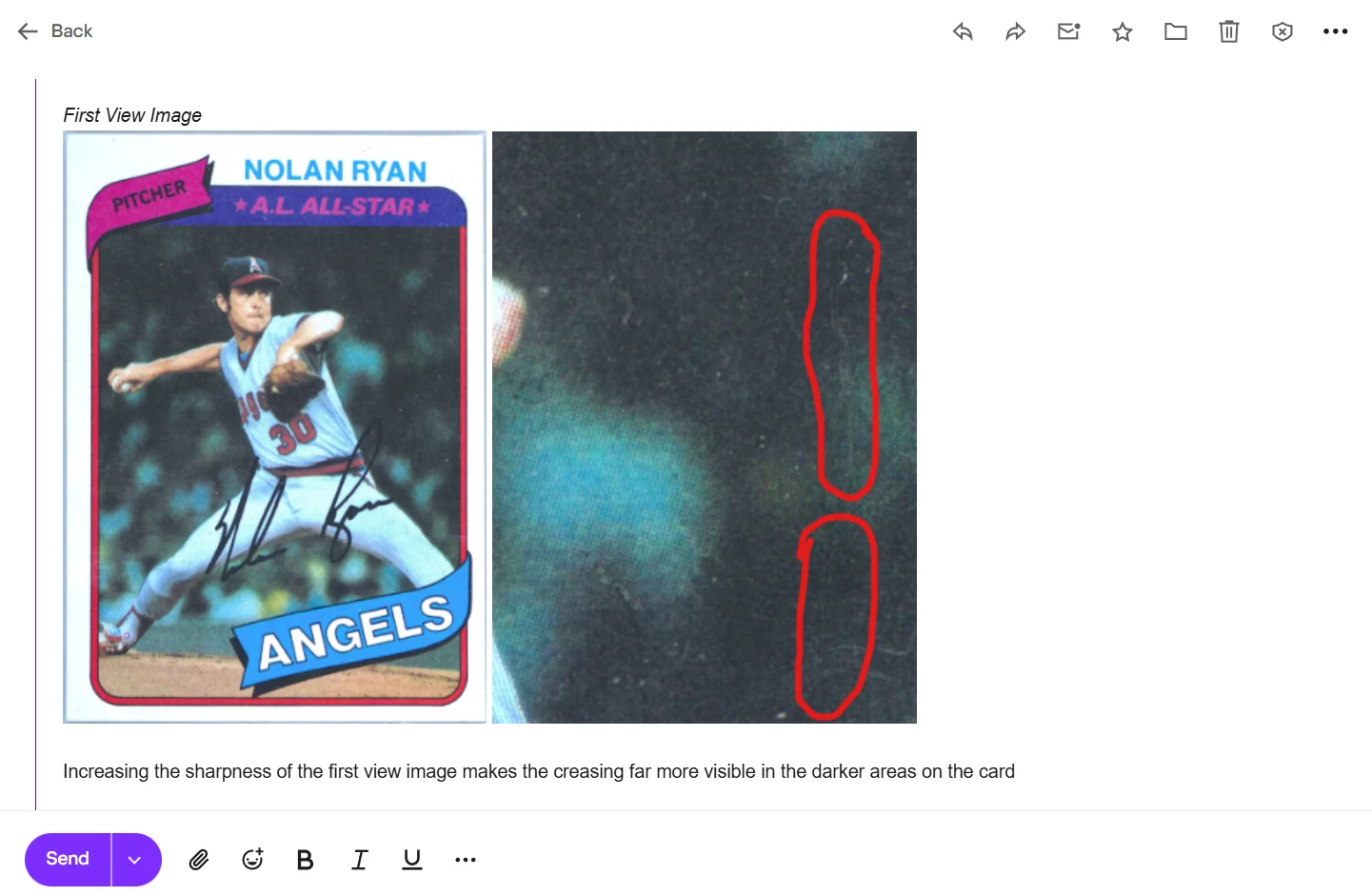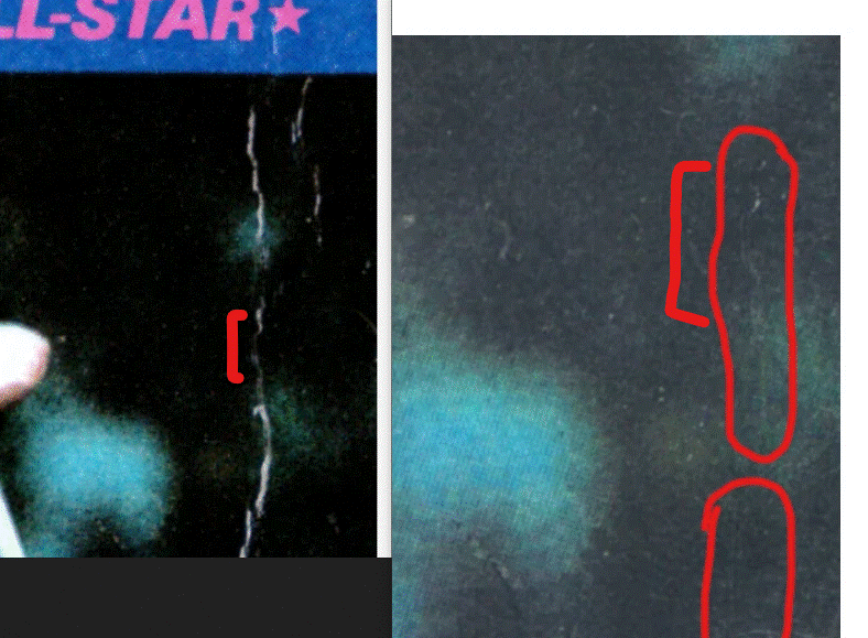 https://i.ebayimg.com/images/g/G68AA...X/s-l1600.webp This is PSA’s own first view scan of my card. The image is perfectly clear — and there’s absolutely nothing showing a crease. Later, they zoomed in, circled a couple of faint streaks in the dark background, and tried to call that “evidence” the crease was already there. They even added the caption “increasing the sharpness makes the creasing far more visible in the darker areas” on the red-circle image. Visible to who? Because to me it looks like they’re circling random shadows in a black background and pretending that’s proof. And if anything, the horizontal streaks at the bottom of the red circle are far more distinct — if we’re just guessing, those would look more like creases than the faint vertical line they pointed to. For a card that’s worth less than $5 once it’s this badly creased — and with damage this obvious — there’s no way in hell I would’ve ever submitted it for grading. And even if we pretend for a second that I did send it in like that, the idea that PSA can just circle some random lines on this intake scan and call that proof is absolutely preposterous. https://i.ebayimg.com/images/g/AjIAA...h/s-l1600.webp https://i.ebayimg.com/images/g/Q4IAA...l/s-l1600.webp Still not sure what they expect me to see here… no red circles this time? How am I supposed to know what’s wrong without red circles?! Guess I’m just supposed to use my imagination. Here’s what the card actually looked like when I got it back from them — the crease jumps out from every angle: https://i.ebayimg.com/images/g/sa0AA...h/s-l1600.webp https://i.ebayimg.com/images/g/bOcAA...g/s-l1600.webp https://i.ebayimg.com/images/g/iewAA...j/s-l1600.webp https://i.ebayimg.com/images/g/ZtEAA...j/s-l1600.webp https://i.ebayimg.com/images/g/byQAA...y/s-l1600.webp https://i.ebayimg.com/images/g/eMEAA...y/s-l1600.webp https://i.ebayimg.com/images/g/czIAA...y/s-l1600.webp The crease is massive and impossible to miss in person. To suggest this damage was there all along — when their own intake scan shows nothing — is laughable. Last edited by bonds0128; 09-19-2025 at 11:19 AM. |