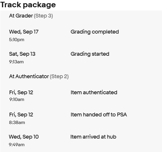 Value plus is pretty much the same Tue, Sep 16 5:31pm Grading completed Wed, Aug 27 7:37pm Grading started At Authenticator (Step 2) Wed, Aug 27 12:45pm Item authenticated Wed, Aug 27 12:44pm Item handed off to PSA Tue, Aug 26 6:08pm Item approved to ship forward Tue, Aug 26 9:03am Potentially does not match item listing Mon, Aug 25 5:49am Item arrived at hub