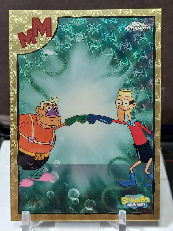 My son & I opened them. First impressions. Great character shots. Quality Control seems off on a few of the cards. A majority of the refractors have rough cuts on the top section. There were also a number of cards that were off-center. Anyway, we were fortunate enough to have hit this & 3 numbered Refractors. Paul Tibbit auto numbered 4/10. ![]() This card is NFS & I am not trying to solicit anything. I was really surprised better SSP's were in blaster boxes. My son grew up on Spongebob. I really like the fact a lot of the cards feature the first 3 seasons & the first movie. Other than the QC issues, this is a really nice set.