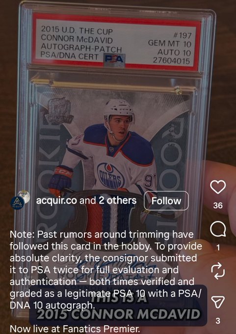 Humorously, the Fanatics description doesn't mention anything about the history of the card, but the consignor selling the card did put out a video talking about PSA "reviewing" the card. https://www.instagram.com/reel/DRIS5...JnNnlnNTJ6bmtx Clearly, psa didn't use or accept this evidence upon the review.